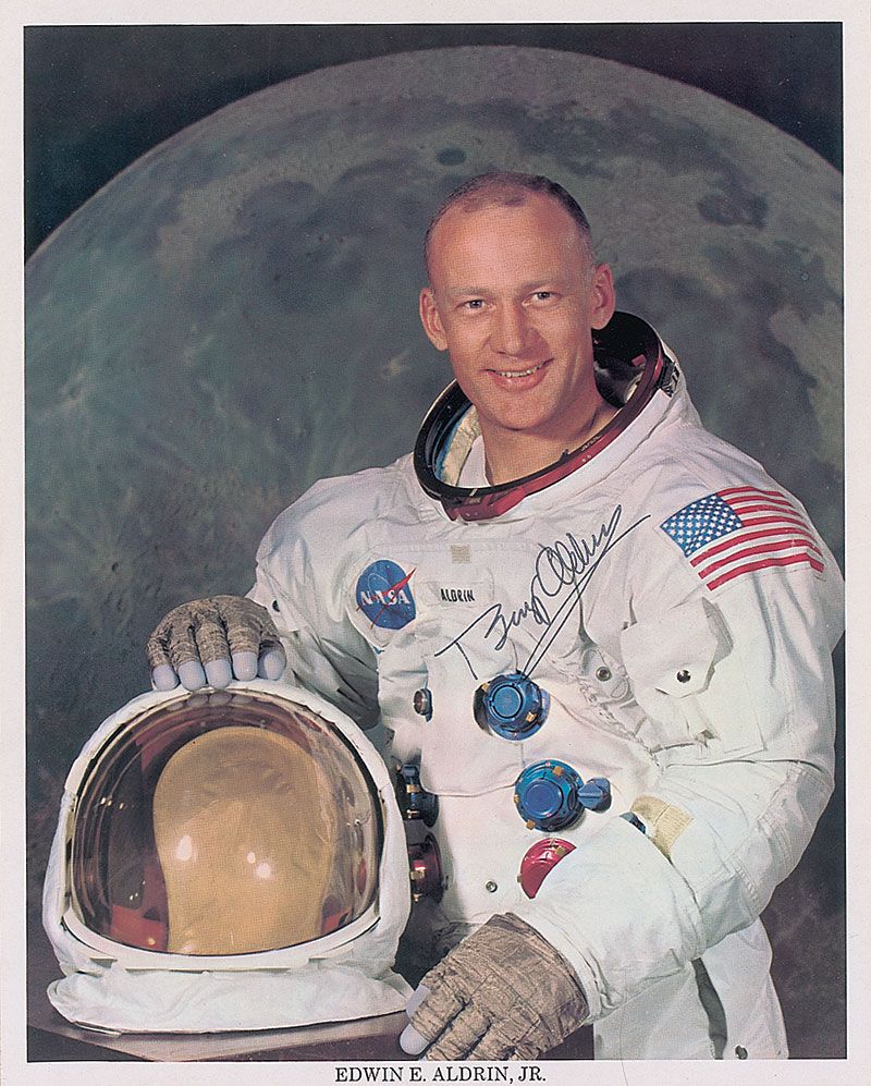 Color 8 x 10 NASA photo of Aldrin posing in his white space suit, signed in black ballpoint. In fine to very fine condition.