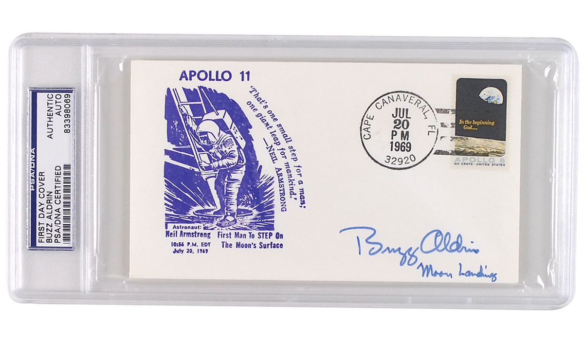 Commemorative cover with a cachet honoring the Apollo 11 moon landing, signed at the bottom in blue felt tip, “Buzz Aldrin, Moon Landing.” Encapsulated in a plastic PSA/DNA authentication holder. In very fine condition.