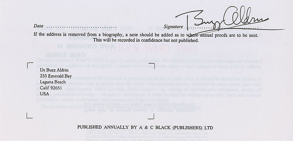 Proof sheet for the 1997 edition of Who’s Who, one page, 8.25 x 11.75, with a printed biography of Aldrin in the middle, and a request for any further revisions. Aldrin adds at the bottom, “golf,” as well as “to be published in July, 1996 is new Sci-Fi Book ‘Encounter with Tiber.’’” Signed at the conclusion by Aldrin. In fine condition, with expected mailing folds.