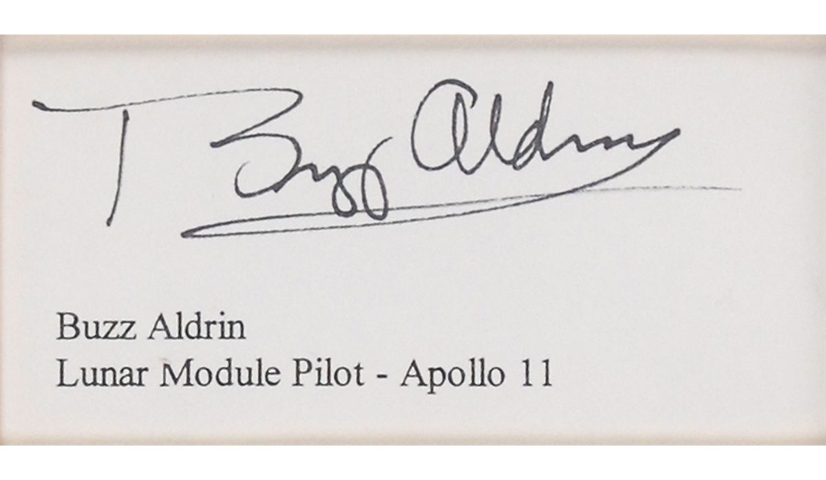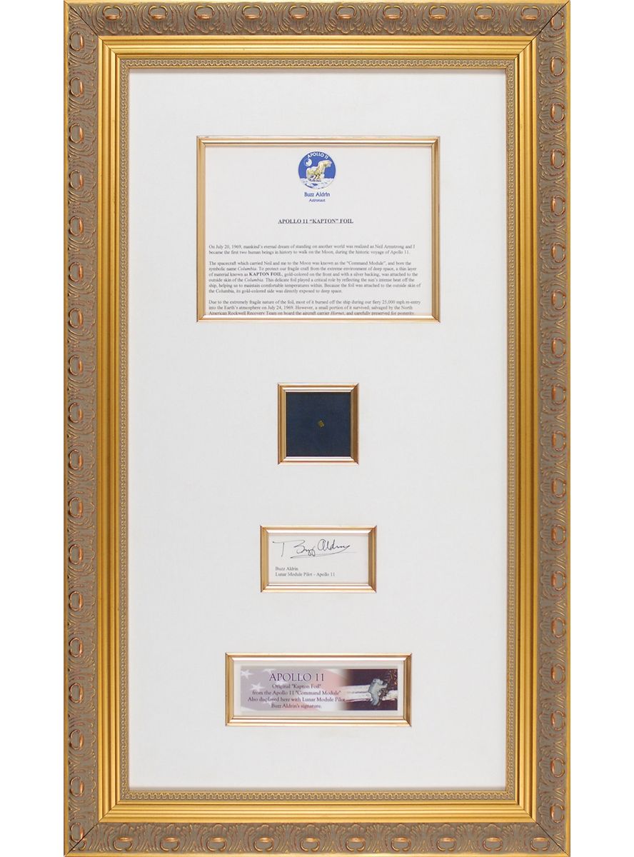A flown piece of the Columbia’s Command Module gold Kapton foil, nicely cloth matted and framed with an ink signature, “Buzz Aldrin,” from a descriptive sheet telling the story of the material’s role on the spacecraft, along with the upper portion of the same sheet to an overall size of 18 x 30.5. In very fine condition. Oversized.