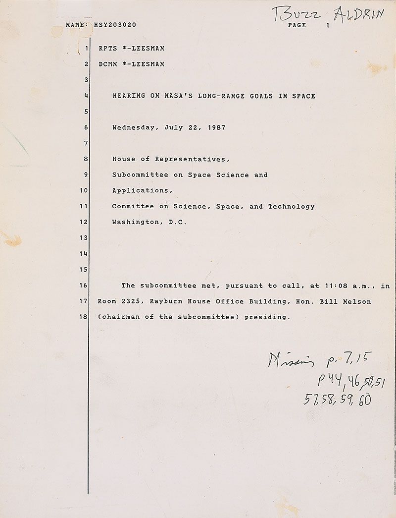 Printed transcript, approximately 80 pages (with about 10 missing pages), 8.5 x 11, of the “Hearing on NASA’s Long-Range Goal In Space,” held on July 22, 1987, signed along the top edge of the cover sheet, “Buzz Aldrin,” listing the missing pages at the bottom. A few smalls stains to cover and expected handling wear, otherwise fine condition.