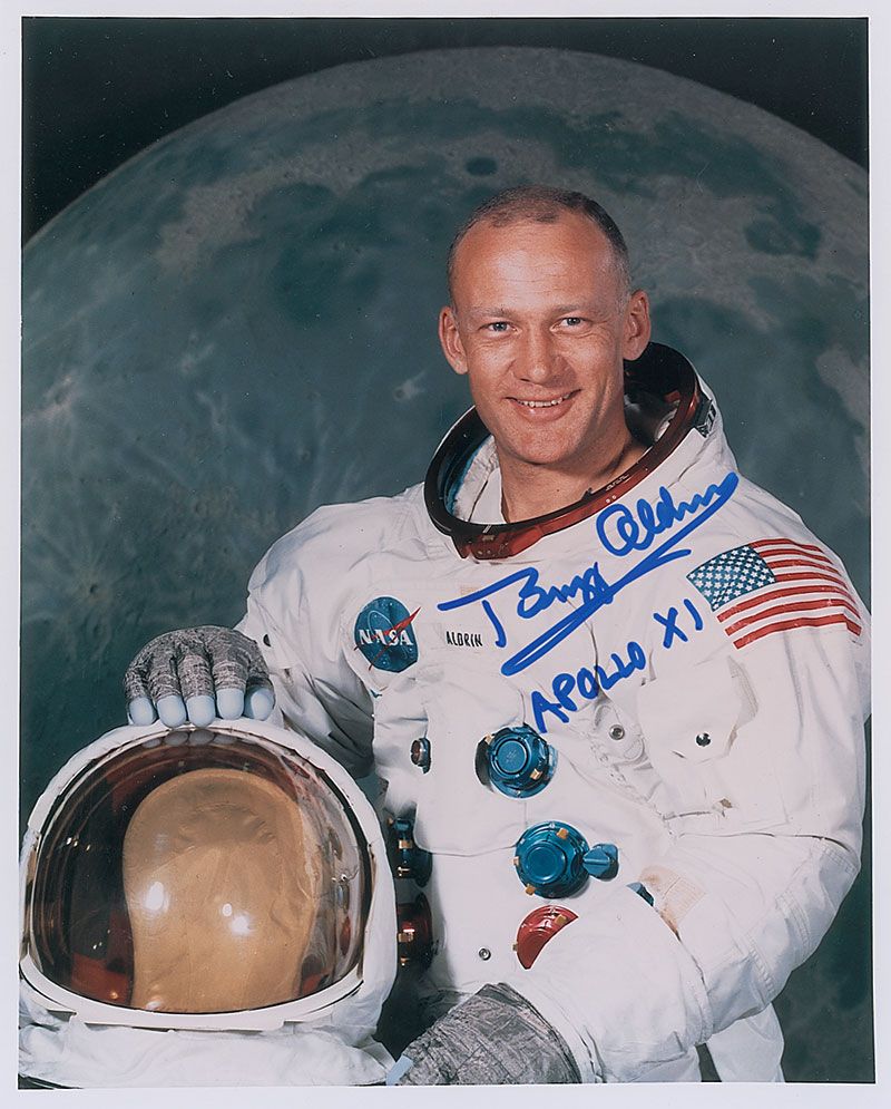 Color satin-finish 8 x 10 photo of Aldrin in his white space suit before a lunar backdrop, signed in blue felt tip, “Buzz Aldrin, Apollo XI.” In very fine condition.