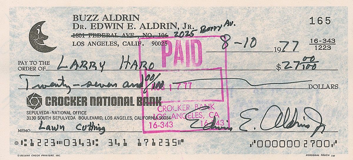 Personal check, 6 x 2.75, filled out and signed by Aldrin, “Edwin E. Aldrin, Jr.,” payable to Larry Haro for $27.00, August 10, 1977. In fine condition, with a bank stamp to body over first name of signature.