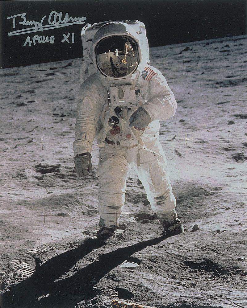 Color satin-finish 8 x 10 photo of Aldrin on the lunar surface, signed in silver ink, “Buzz Aldrin, Apollo XI.” Photo is partially affixed to an identical size piece of cardstock. In fine condition.