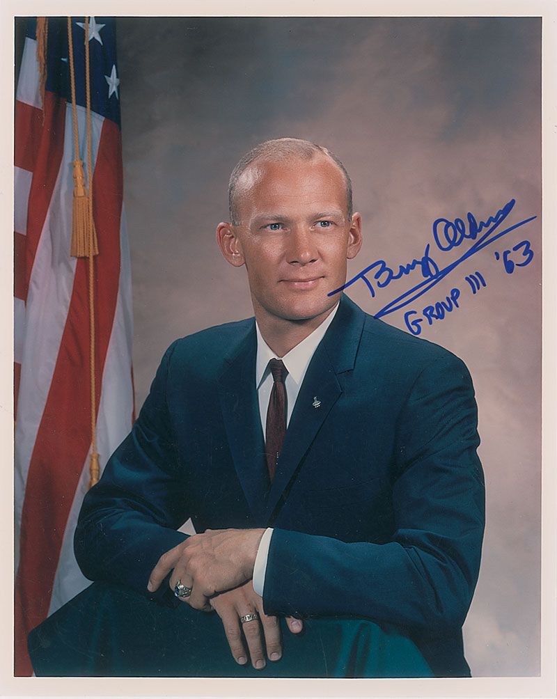 Color satin-finish 8 x 10 photo of Aldrin posing in a jacket and tie, signed in blue felt tip, “Buzz Aldrin, Group III ’63.” In very fine condition.