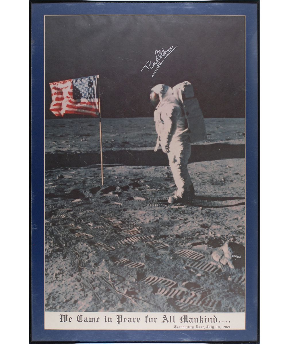Color limited edition 21 x 33 poster of Aldrin facing the American flag on the lunar surface, numbered 258/1969, with “We came in peace for all mankind…Tranquility Base, July 20, 1969,” printed in the lower border, signed in silver ink. Matted and framed to an overall size of 24 x 36. In fine condition. Oversized.