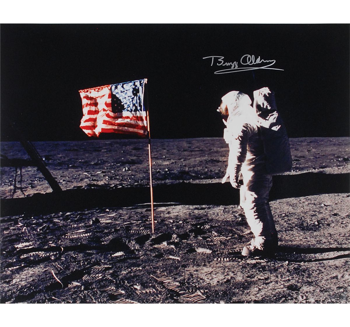 Color satin-finish 20 x 16 photo of Aldrin facing the American flag on the lunar surface, signed in silver ink. In fine condition.