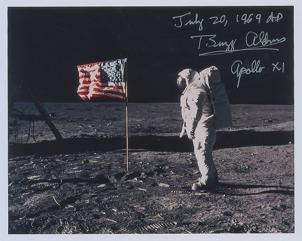 Color satin-finish 10 x 8 photo of Aldrin facing the American flag while on the lunar surface, signed in silver ink, “July 20, 1969 AD, Buzz Aldrin Apollo XI.” In very fine condition.