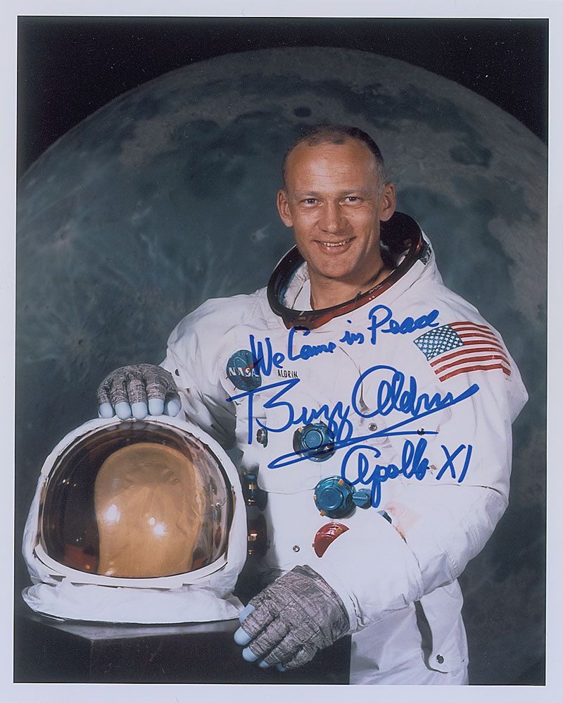 Color satin-finish 8 x 10 photo of Aldrin posing in his white space suit, signed in blue felt tip, “We came in peace, Buzz Aldrin, Apollo XI.” In very fine condition.