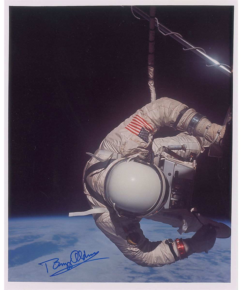 Color satin-finish 8 x 10 photo of Aldrin performing his space walk during the Gemini 12 mission, signed in blue felt tip. In very fine condition.