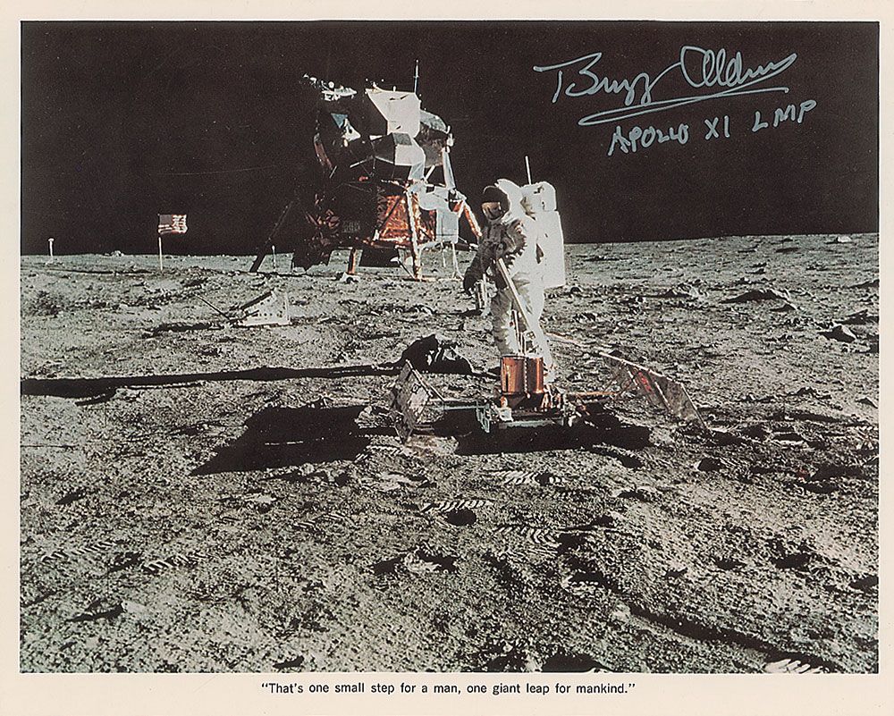 Official color 10 x 8 NASA lithograph of Aldrin deploying the ALSEP package on the lunar surface, signed in silver ink, “Buzz Aldrin Apollo XI LMP.” In very fine condition. From the Leslie Cantwell collection.