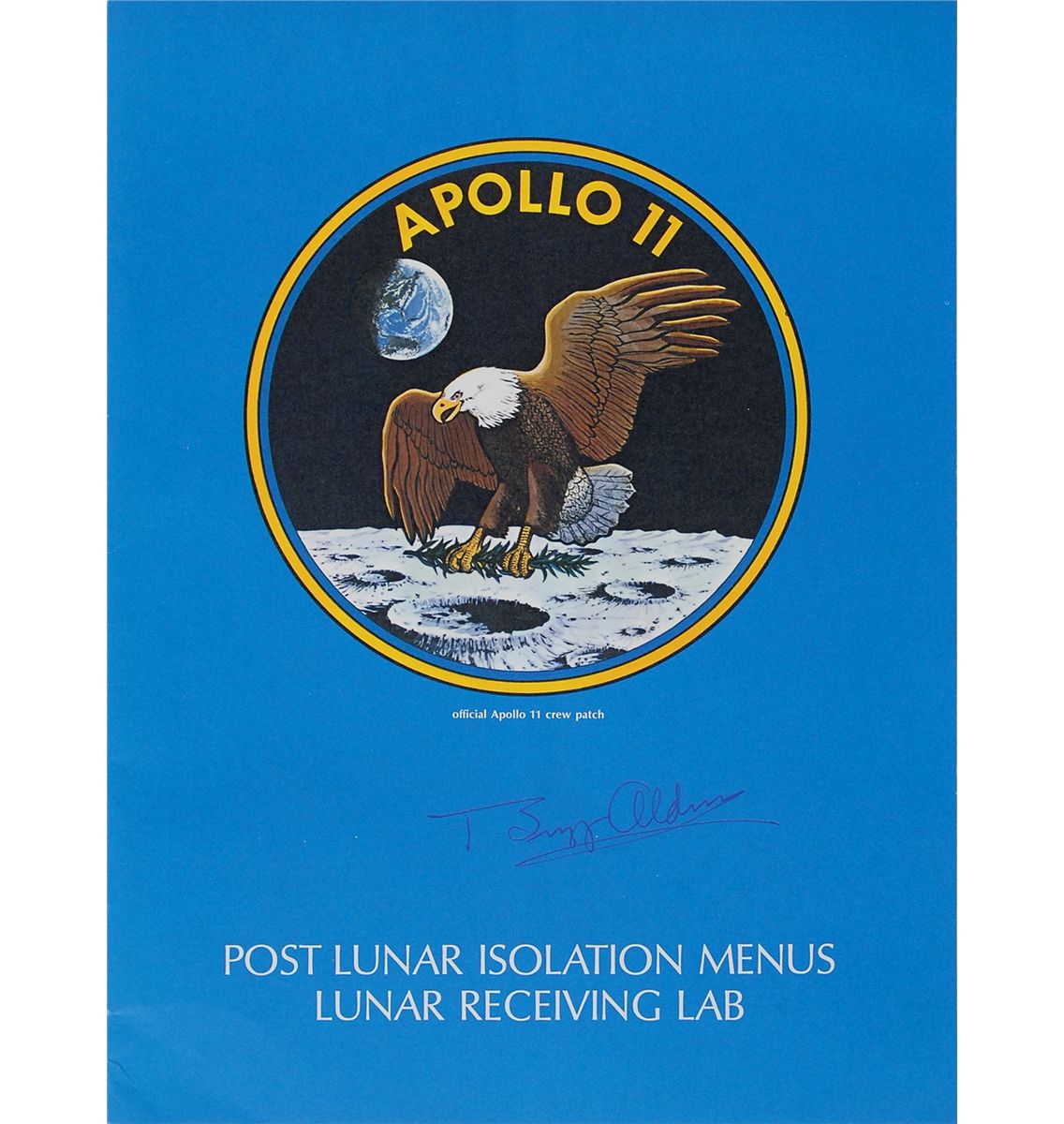 Original and complete Apollo 11 21-day quarantine menu, 8.25 x 11, listing all the selections for breakfast, lunch, and dinner, during the crew’s three weeks in isolation, produced by Stouffer’s, signed on the front cover in blue ballpoint by Aldrin. In fine condition, with a light central vertical bend.
