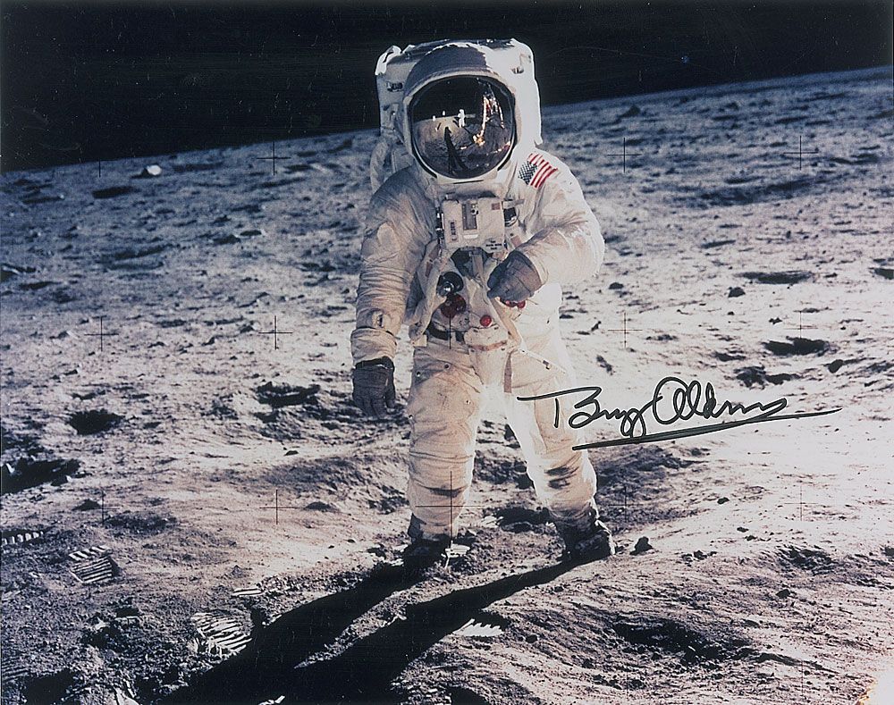 Choice color satin-finish 10 x 8 photo of Aldrin on the lunar surface, signed in black felt tip. In very fine condition.