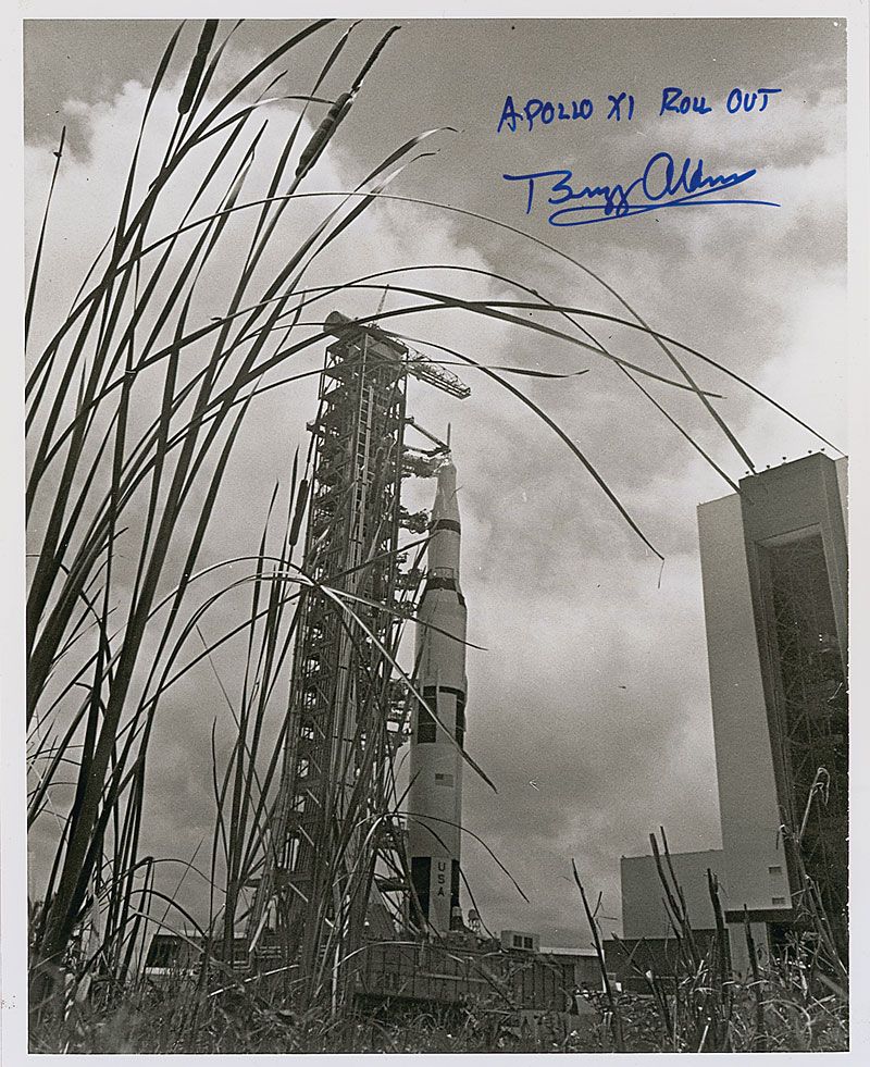 Official glossy 8 x 10 NASA photo of the Apollo 11 spacecraft leaving the Vehicle Assembly Building, signed in blue felt tip, “Apollo XI Roll Out, Buzz Aldrin.” In fine condition.