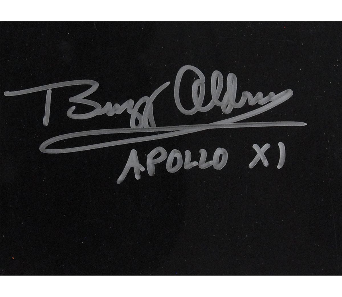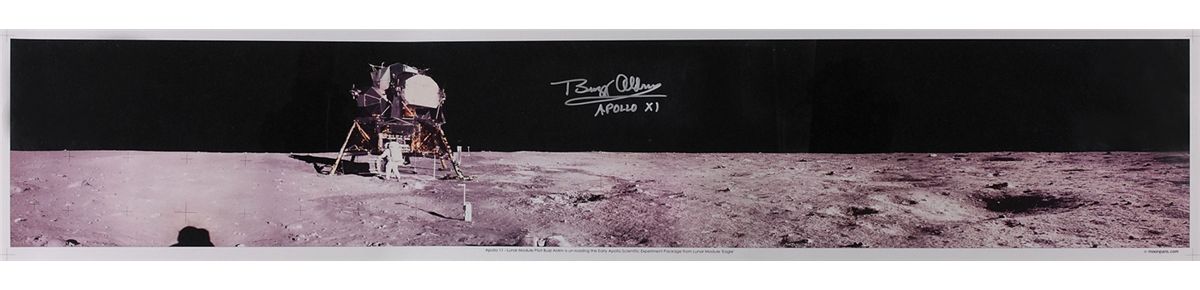 Color satin-finish 40.5 x 8.5 panoramic photo of Aldrin unloading the EASEP package from the Eagle during the Apollo 11 mission, signed in silver ink, “Buzz Aldrin, Apollo XI.” In very fine condition. Rolled.