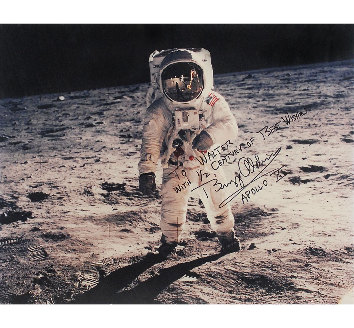 Color satin-finish 20 x 16 photo, signed and inscribed in black felt tip, “To Walter, with 1/2 century of best wishes, Buzz Aldrin, Apollo XI.” In fine condition. Rolled.