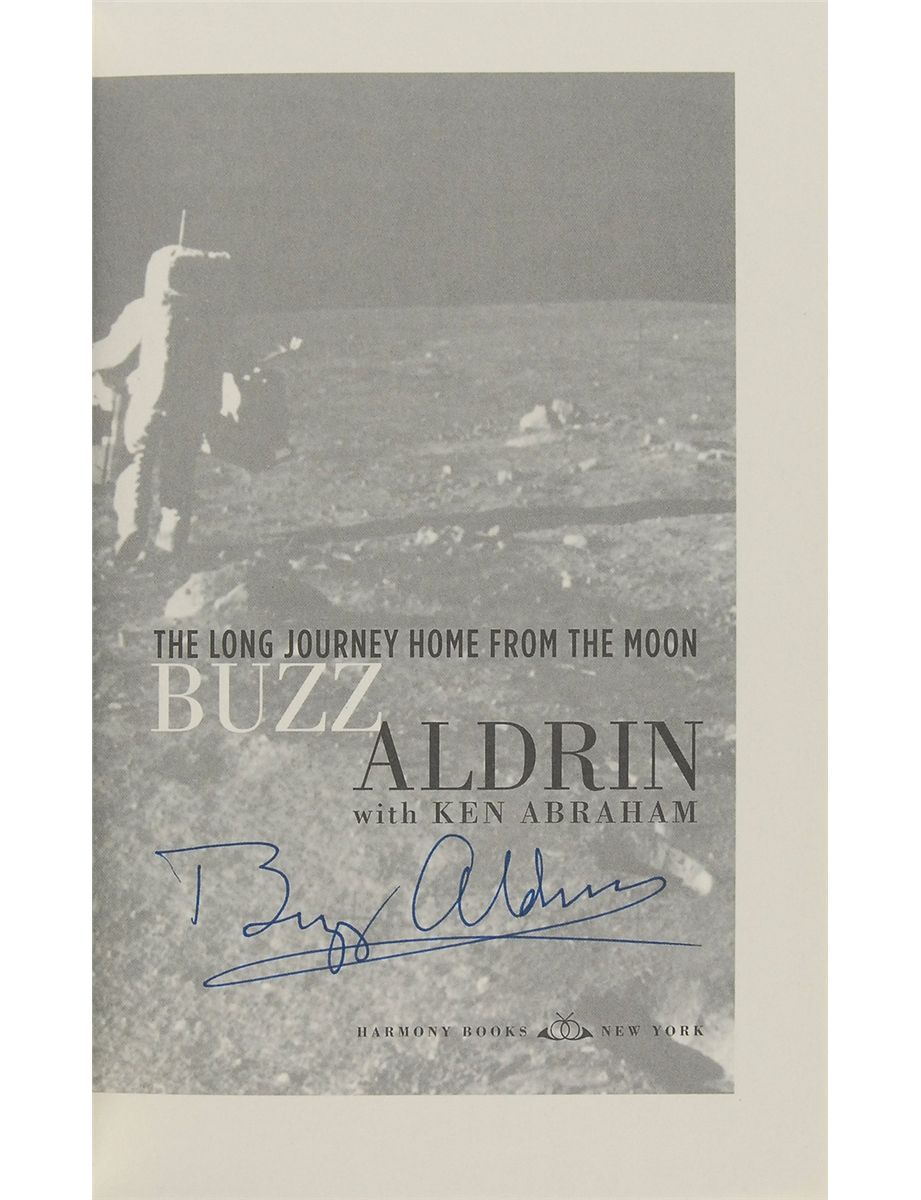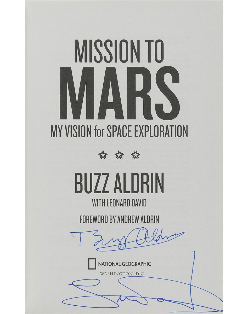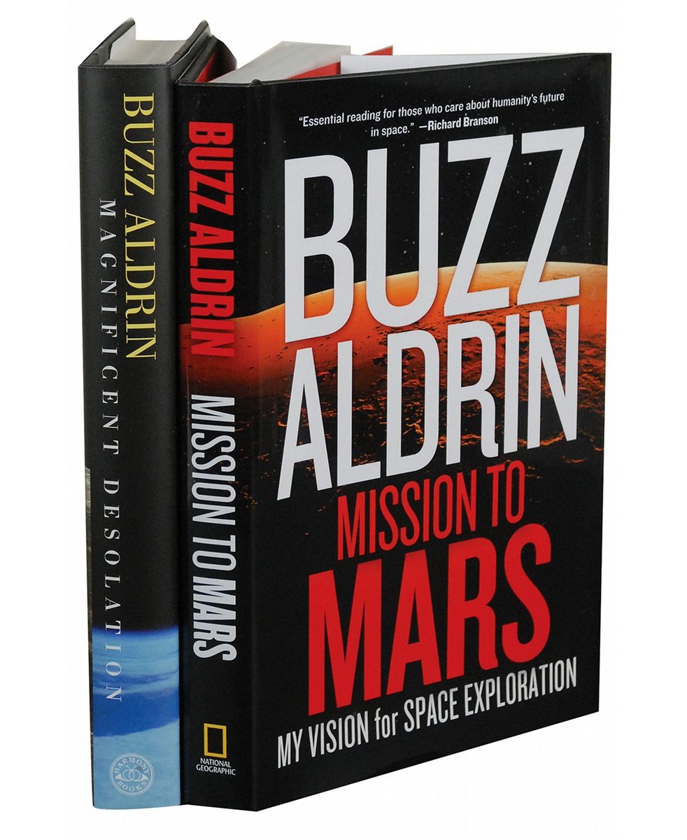Two books: a hardcover first edition of Magnificent Desolation, signed on the title page in blue felt tip by Buzz Aldrin; and a hardcover edition of Mission to Mars, signed on the title page in blue felt tip by Buzz Aldrin and co-author Leonard David. In overall very fine condition.