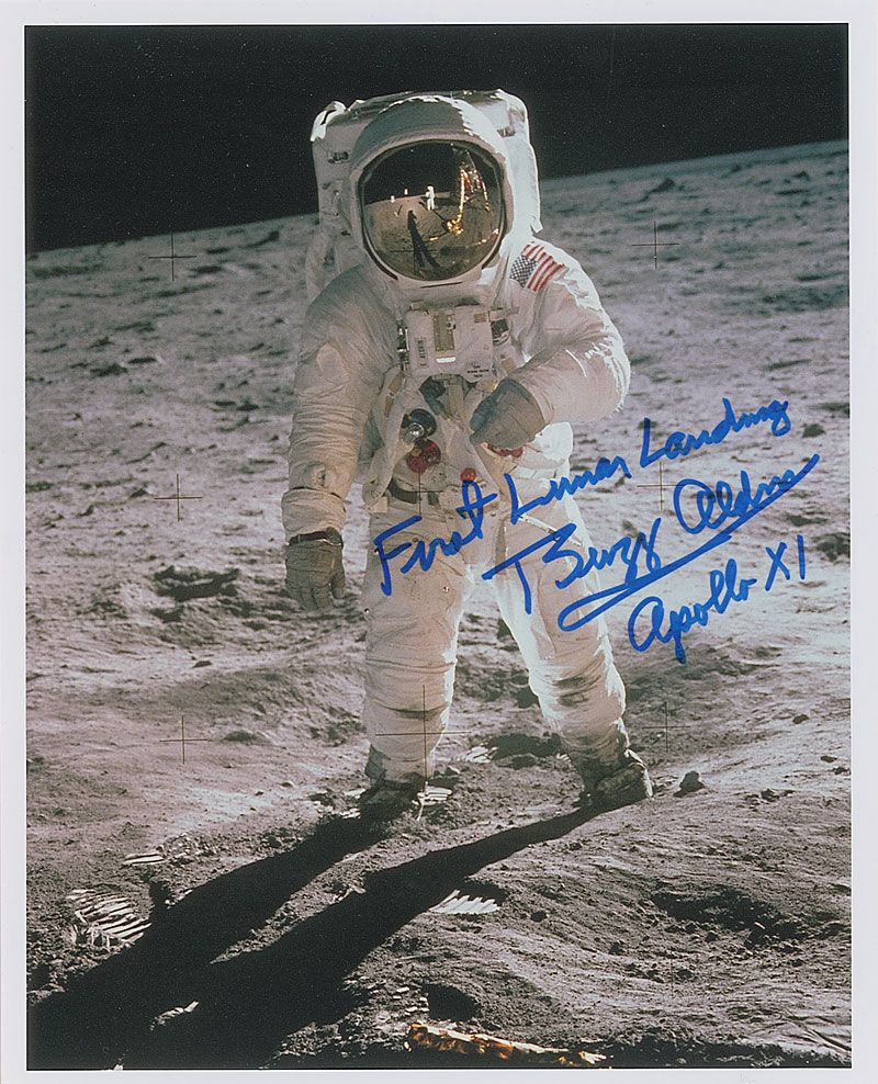 Color satin-finish 8 x 10 photo of Aldrin on the lunar surface, signed in blue felt tip, “First lunar landing, Buzz Aldrin Apollo XI.” In very fine condition.