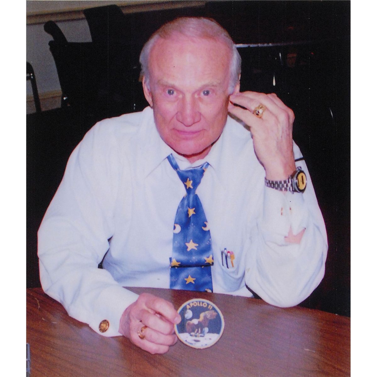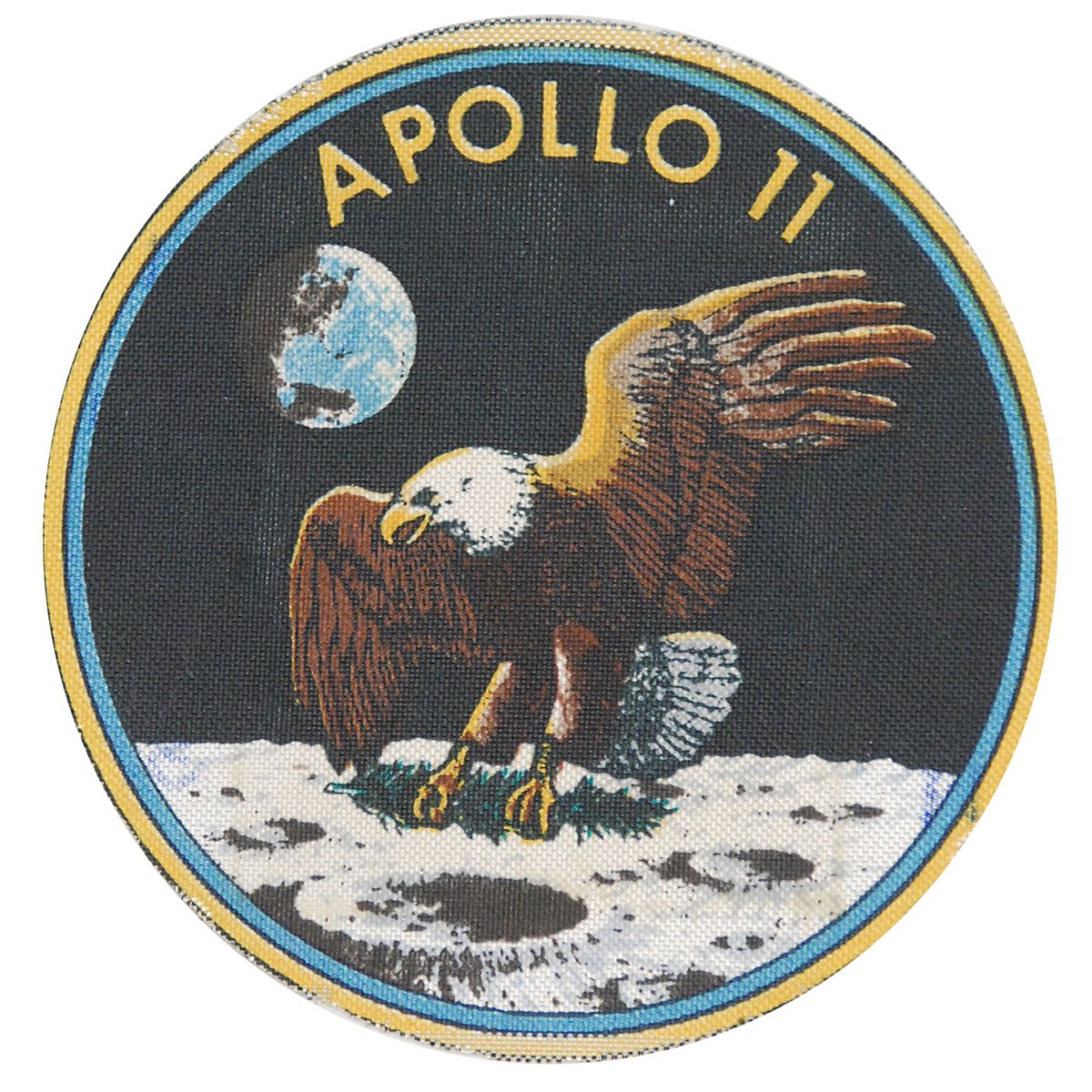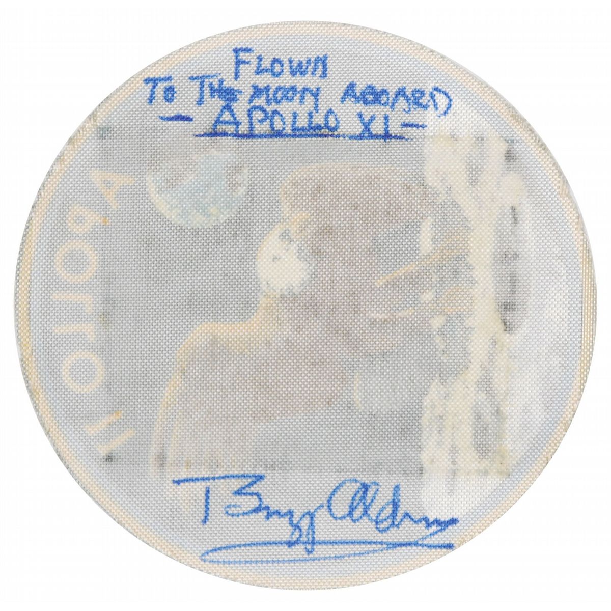 Flown Apollo 11 Beta-cloth patch, 3.5 x 3.5, signed and certified on the reverse by Buzz Aldrin in blue ink, “Flown to the moon aboard Apollo XI, Buzz Aldrin.” In fine condition, with somewhat rough edges and a square spot of toning to reverse of emblem, just barely touching any writing. Accompanied by a 8.5 x 11 photograph of Aldrin holding this emblem, captioned, “Buzz Aldrin certifies flown emblem: 3/99.” A fantastic flown artifact from the first lunar landing, with handwritten confirmation and photographic evidence from the second man on the moon.