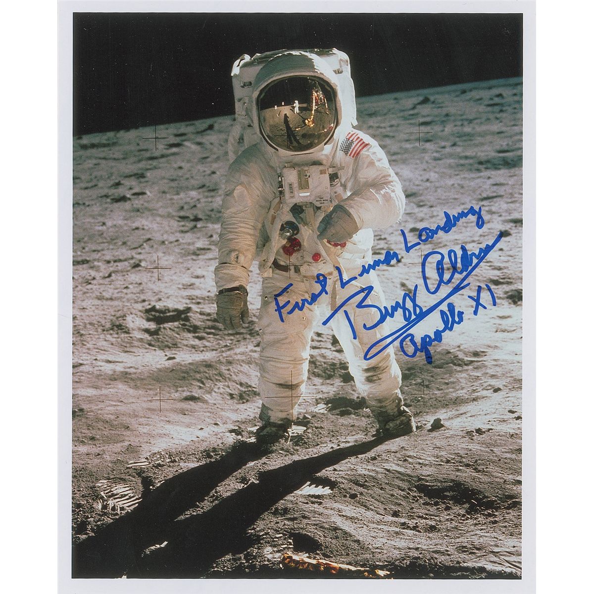 Breathtaking color satin-finish 8 x 10 photo of Aldrin on the lunar surface, signed in blue felt tip, “First lunar landing, Buzz Aldrin, Apollo XI.” In very fine condition.