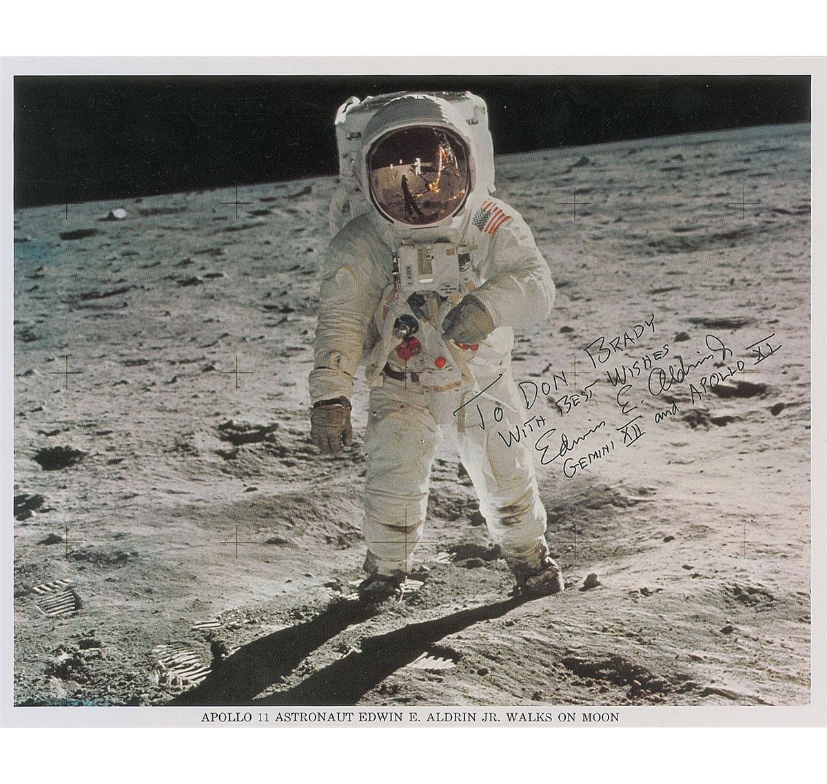 Official color 10 x 8 NASA lithograph of Aldrin on the surface of the moon, signed and inscribed in black ink, “To Don Brady, with best wishes, Edwin E. Aldrin, Jr., Gemini XII and Apollo XI.” In fine condition.