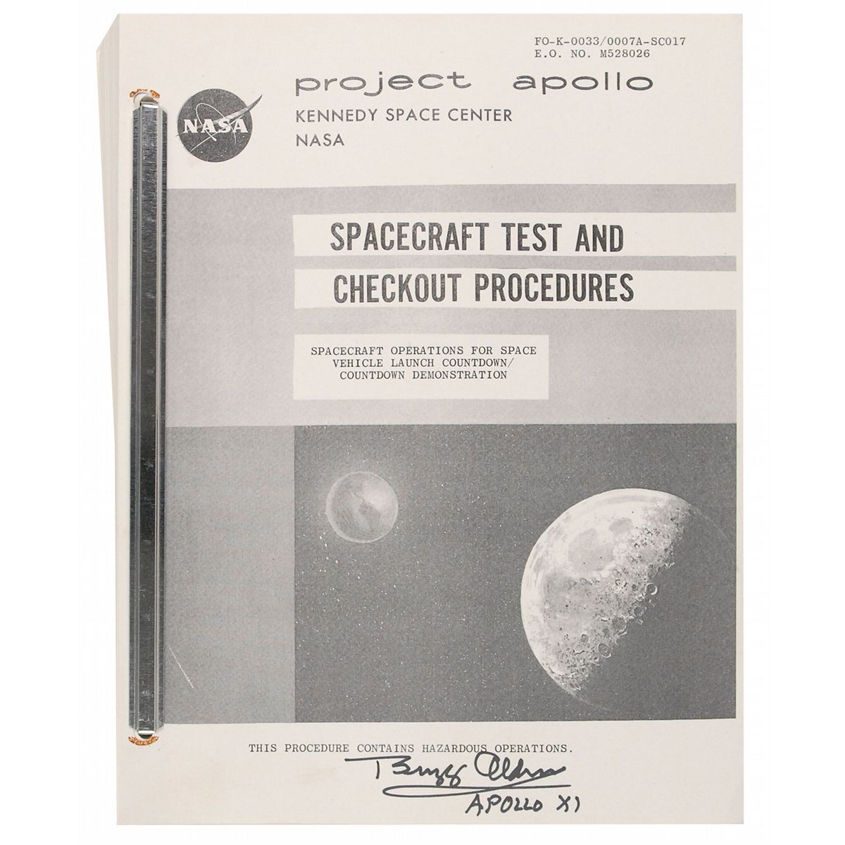 Large bound Project Apollo Spacecraft Test and Checkout Procedures manual, 8.5 x 11, dated October 25, 1967, signed on the front cover in black felt tip, “Buzz Aldrin, Apollo 11.” In fine condition.