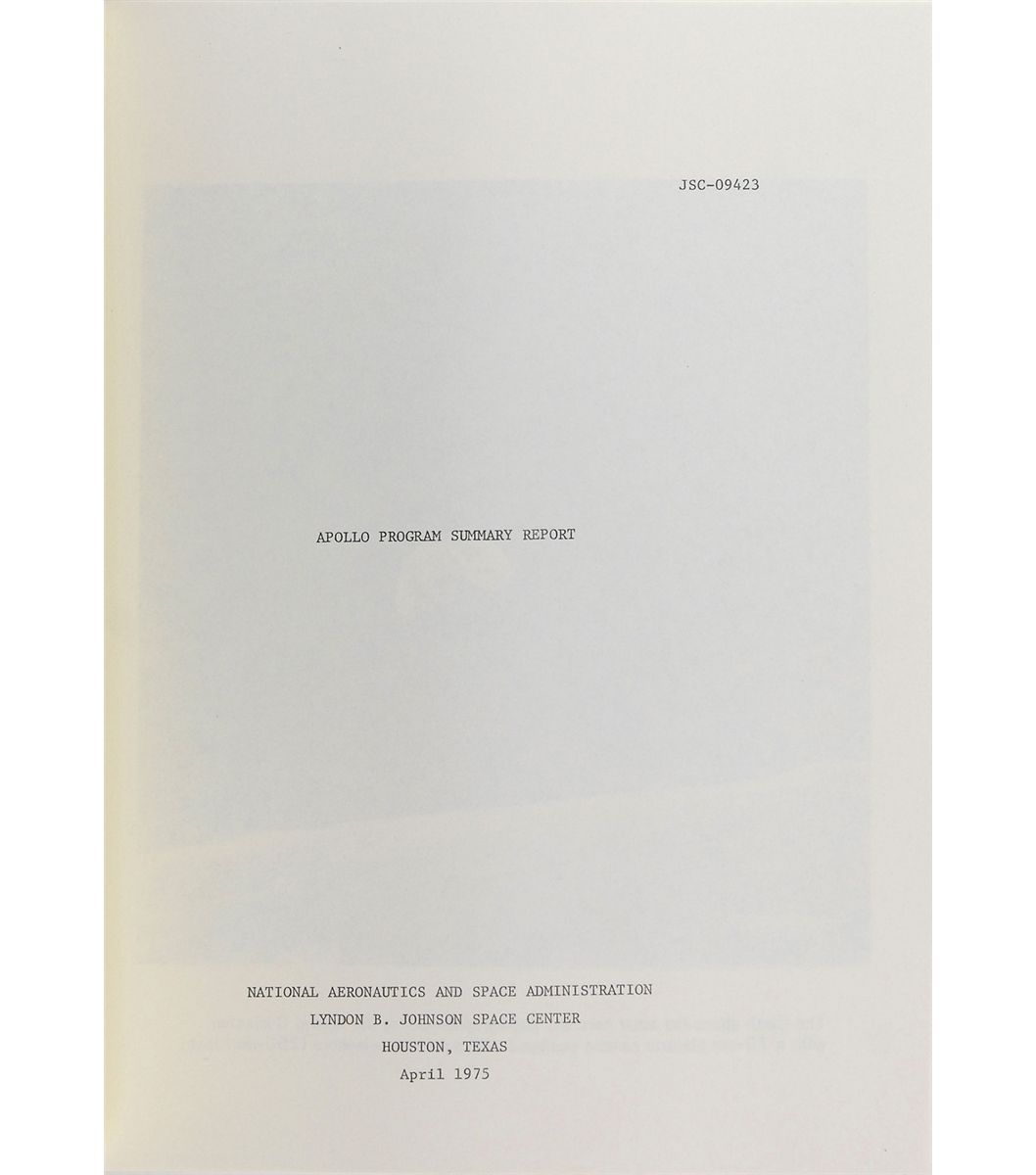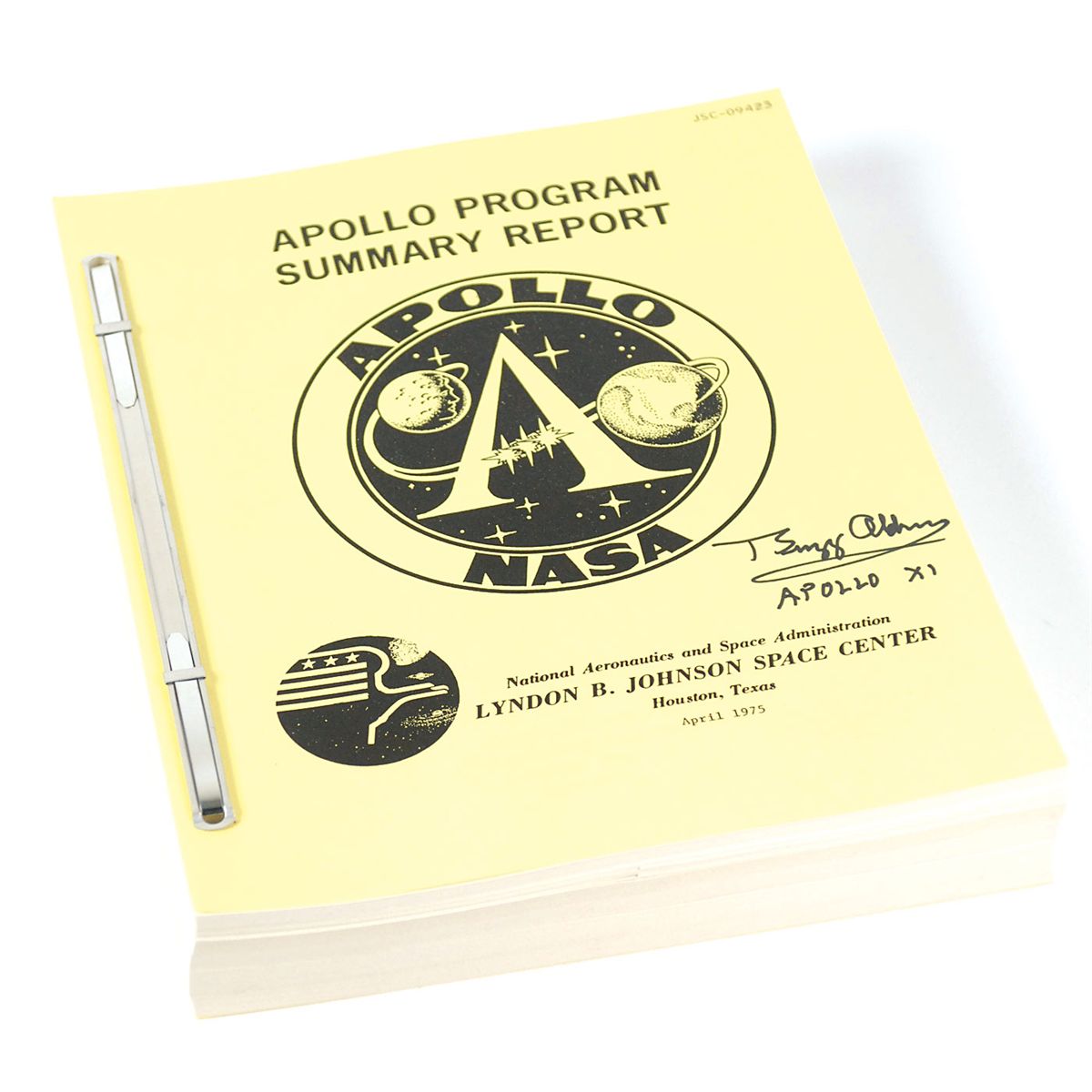 Bound Apollo Program Summary Report issued by the Lyndon B. Johnson Space Center in April of 1975, 8 x 10.5, 425 pages, signed on the front cover in black felt tip, “Buzz Aldrin, Apollo XI.” In very fine condition.