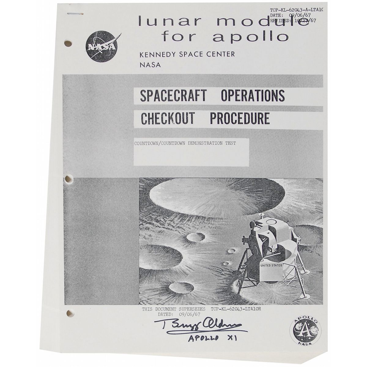Reprint of NASA’s Spacecraft Operations Checkout Procedure, originally printed on September 6, 1967, 8.5 x 11, bound by a single staple, signed on the front cover in black felt tip, “Buzz Aldrin, Apollo XI.” In very fine condition.