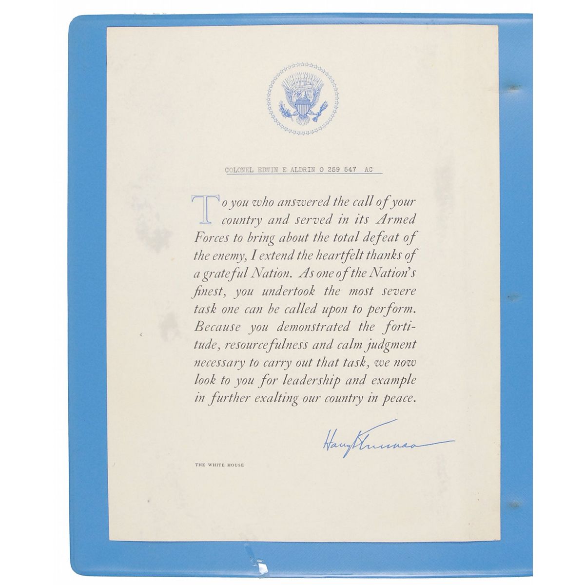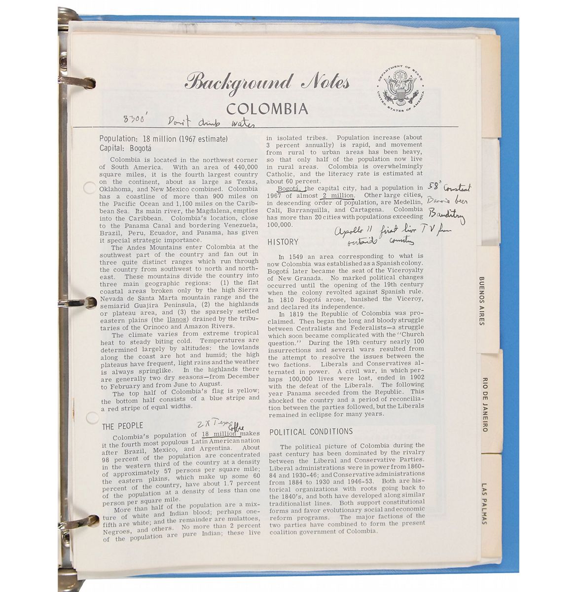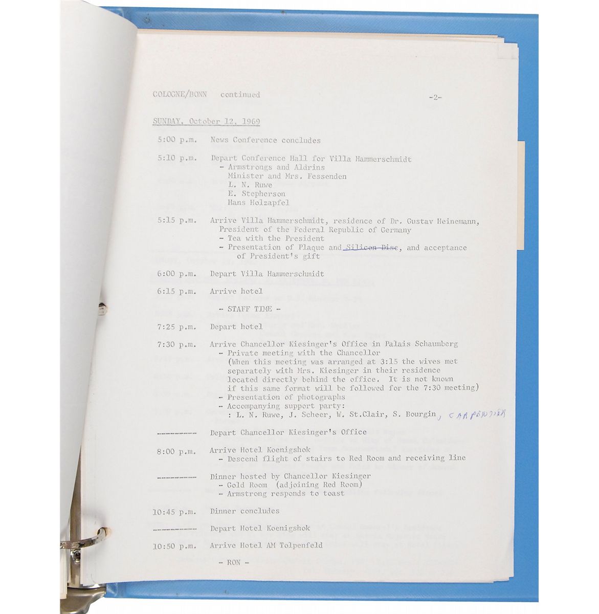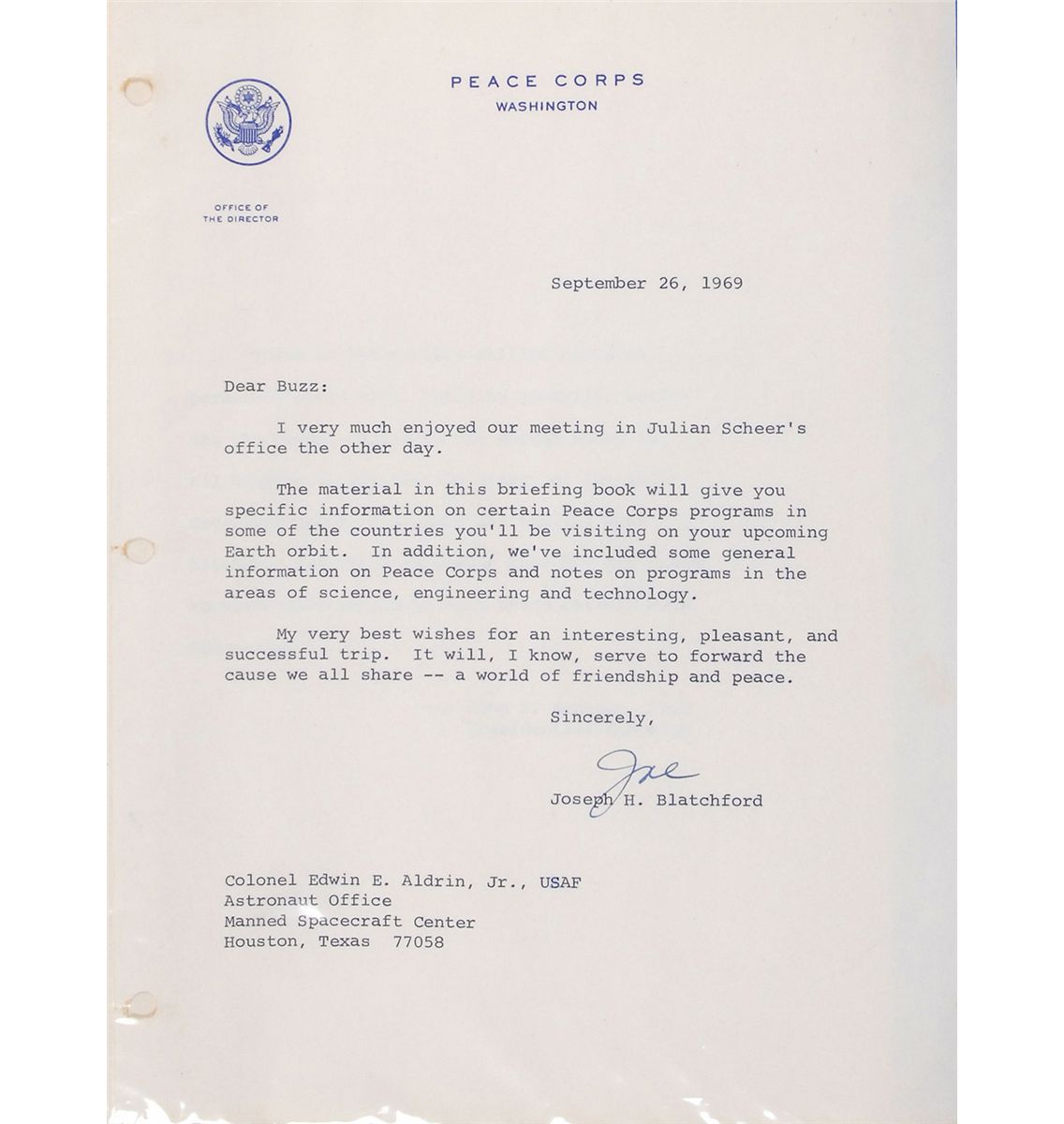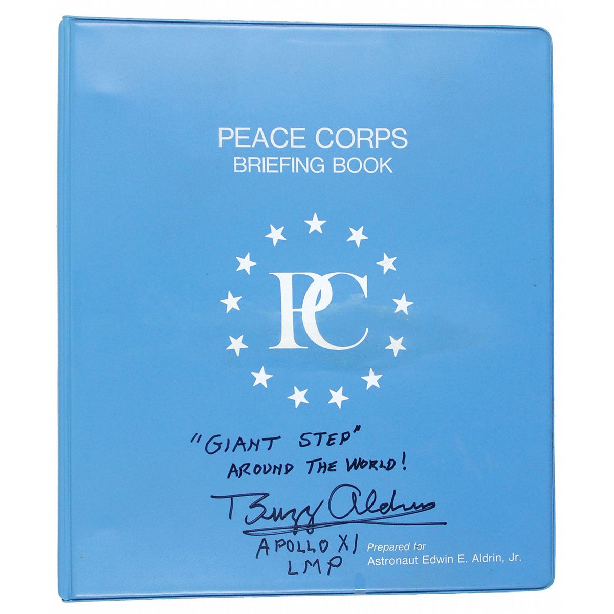 Aldrin’s personally-owned and -used complete notebook binder from a worldwide goodwill tour sponsored by the Peace Corps, September 29 to November 5, 1969, containing outlines and itineraries for each stop, signed on the front cover in black felt tip, “‘Giant Step’ Around the World! Buzz Aldrin, Apollo XI LMP.” The cover is imprinted with the text: “Peace Corps Briefing Book, prepared for Astronaut Edwin E. Aldrin, Jr.” Includes a TLS sent to Aldrin from Peace Corps Director Joseph Blatchford, in part: “The material in this briefing book will give you specific information on certain Peace Corps programs in some of the countries you’ll be visiting on your upcoming Earth orbit…and notes on programs in the areas of science, engineering and technology.” Aldrin added a few handwritten notes to two pages, most interestingly on the ‘background notes’ page for his visit to Bogota, Colombia, he writes: “Don’t drink water” and “Apollo 11 first live TV from outside country.” He also slightly amended the itinerary for their visit to Cologne, Germany. A certificate bearing a pre-printed Harry S. Truman signature is also affixed inside the binder’s front cover. In overall fine condition. The post-Apollo 11 tour visited 24 nations, from Mexico to Japan, and pledged to show the willingness of the United States to share its space knowledge with the rest of the world. A fantastic one-of-a-kind piece.