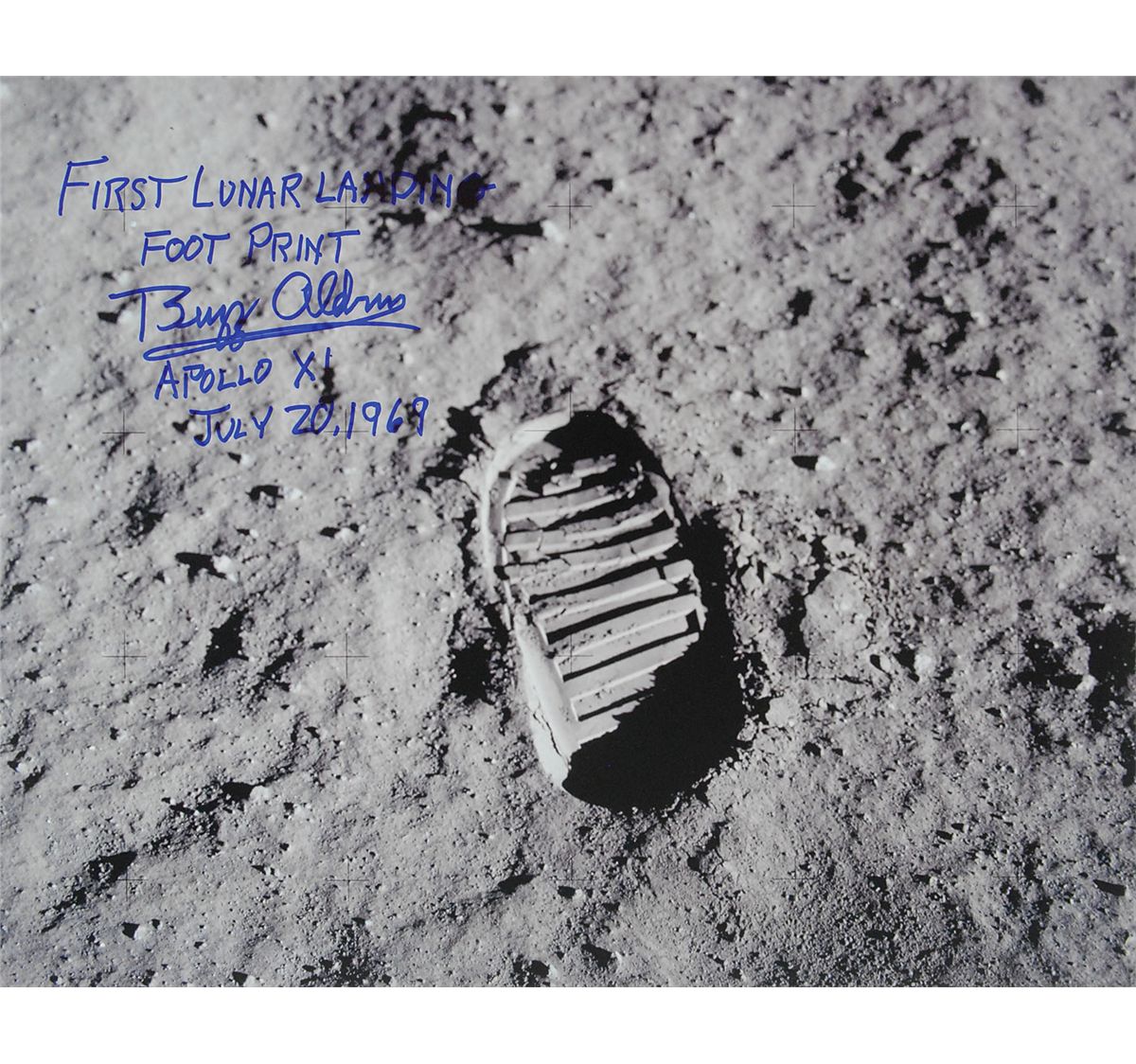 Color satin-finish 20 x 16 photo of the first footprint on the moon, signed in blue felt tip, “First lunar landing foot print, Buzz Aldrin, Apollo XI, July 20, 1969.” In very fine condition.