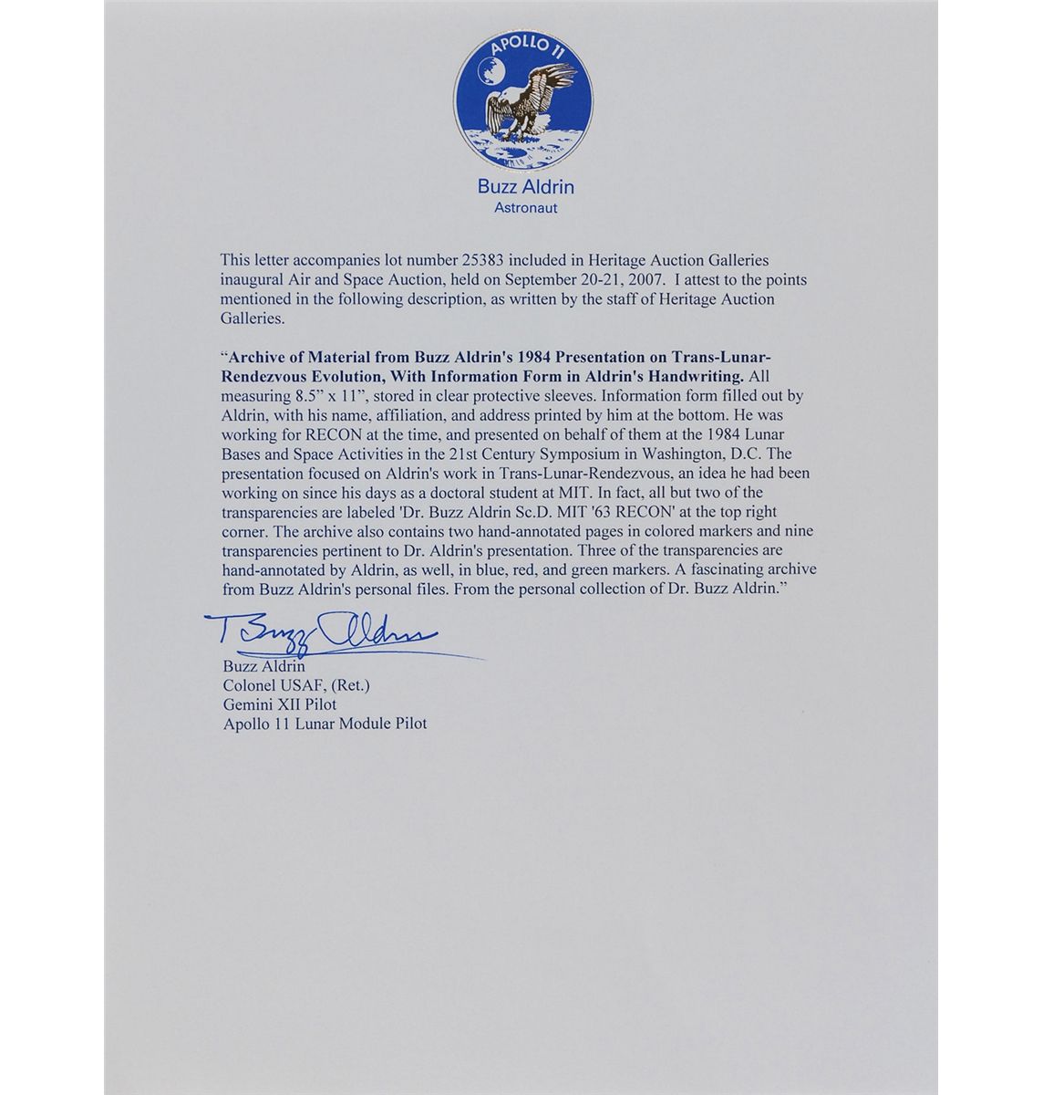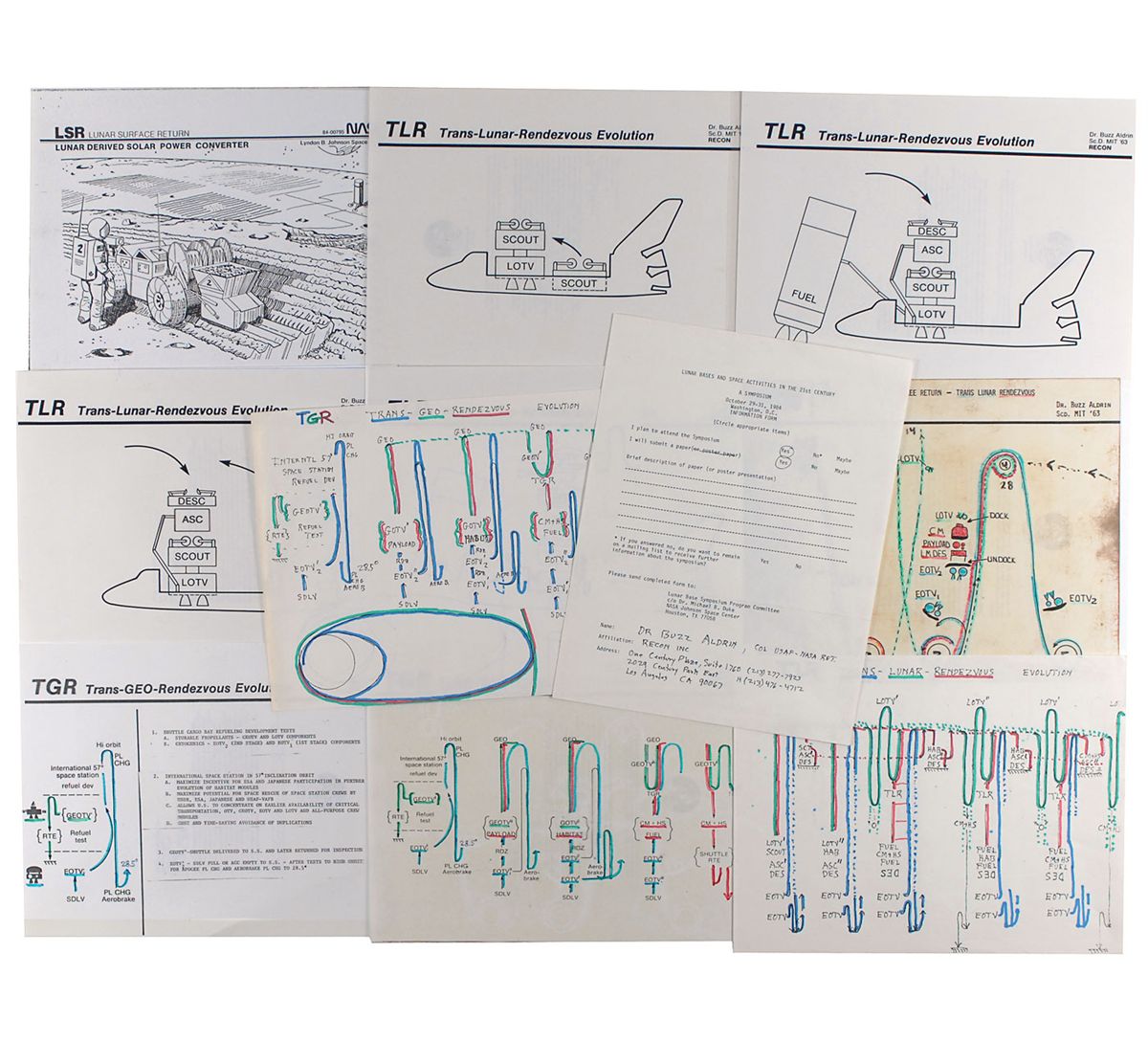 Archive of 11 items from a 1984 NASA presentation on Lunar Surface Return, each 8.5 x 11 or 11 x 8.5, used by Aldrin during a presentation at the Lyndon B. Johnson Space Center. Consists of eight transparency sheets and two worksheets demonstrating mathematical models and logistics concerning the process of a lunar surface return and the devices needed for such a process. Five of the sheets are hand-notated by Aldrin in blue, red, and green felt tip. Also includes a document filled out by Aldrin regarding his attendance at a symposium in Washington. In overall fine condition. Accompanied by a letter of provenance signed by Aldrin stating the transparencies are from his personal collection.