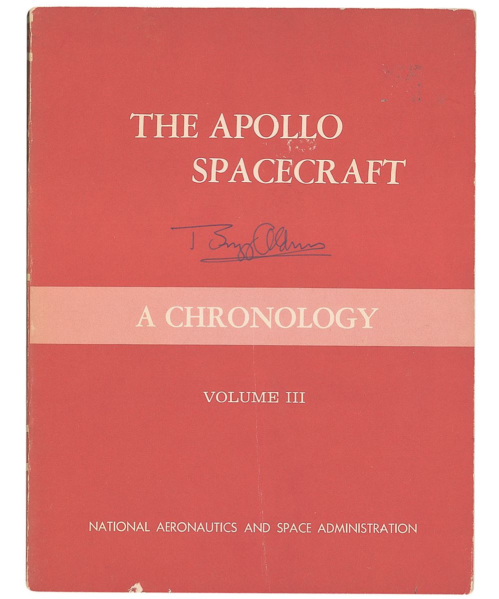 The Apollo Spacecraft: A Chronology, Volume III, 1964–1966, 7.75 x 10.25, 286 pages, signed on the front cover in blue ballpoint by Aldrin. A couple light creases passing through signature, mild handling wear, and some light sunning to spine, otherwise fine condition.