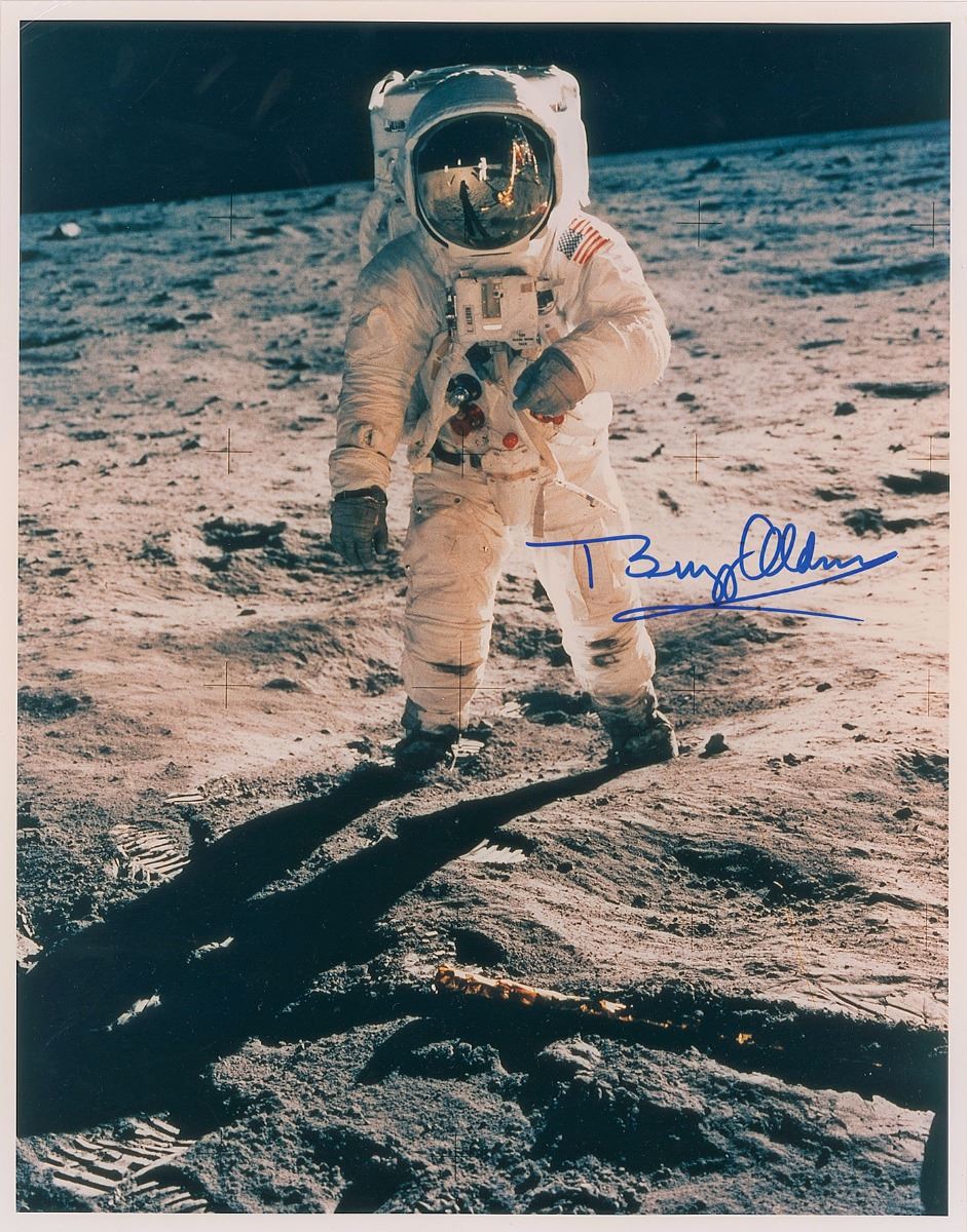 Color satin-finish 11 x 14 photo of Aldrin standing on the lunar surface, signed in blue felt tip. In fine condition, with slight creasing to upper left corner. The Leon Ford Collection.