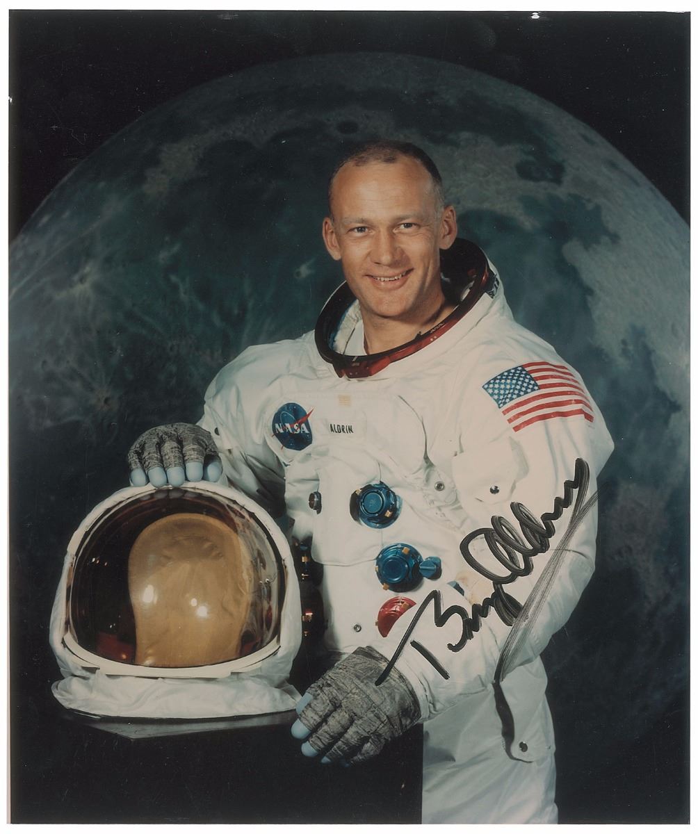Color satin-finish 7.5 x 9 photo of Aldrin posing in his white space suit with the moon in the background, signed in black felt tip. In fine condition, with trimmed edges and a PSA/DNA label affixed to the reverse.