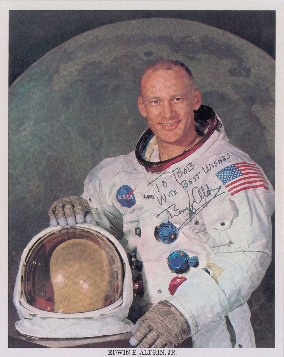 Official color 8 x 10 NASA lithograph of Adrin posing in his white space suit, signed and inscribed in black felt tip, “To Bob, with best wishes, Buzz Aldrin.” In fine condition, with a couple slight bends, and slight creasing to right edge.