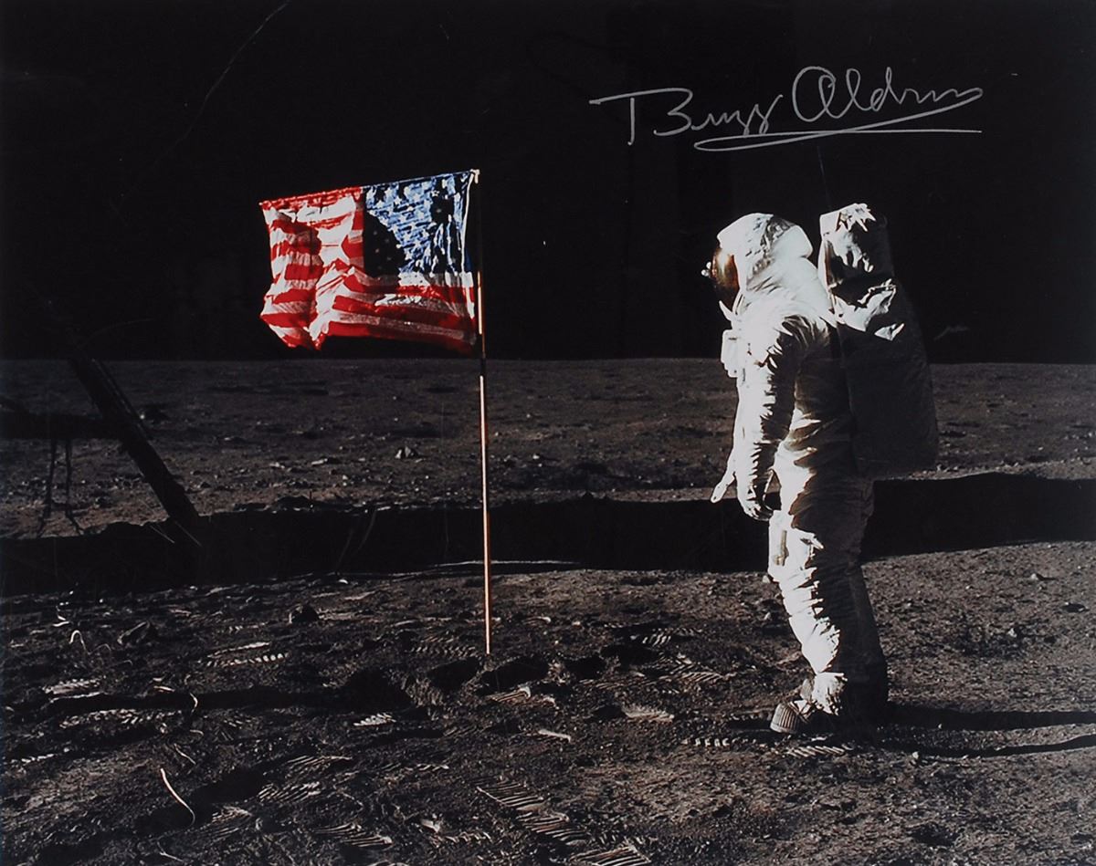 Color satin-finish 20 x 16 photo of Aldrin walking towards the American flag on the surface of the moon, signed in silver ink. Rolled and in fine condition.