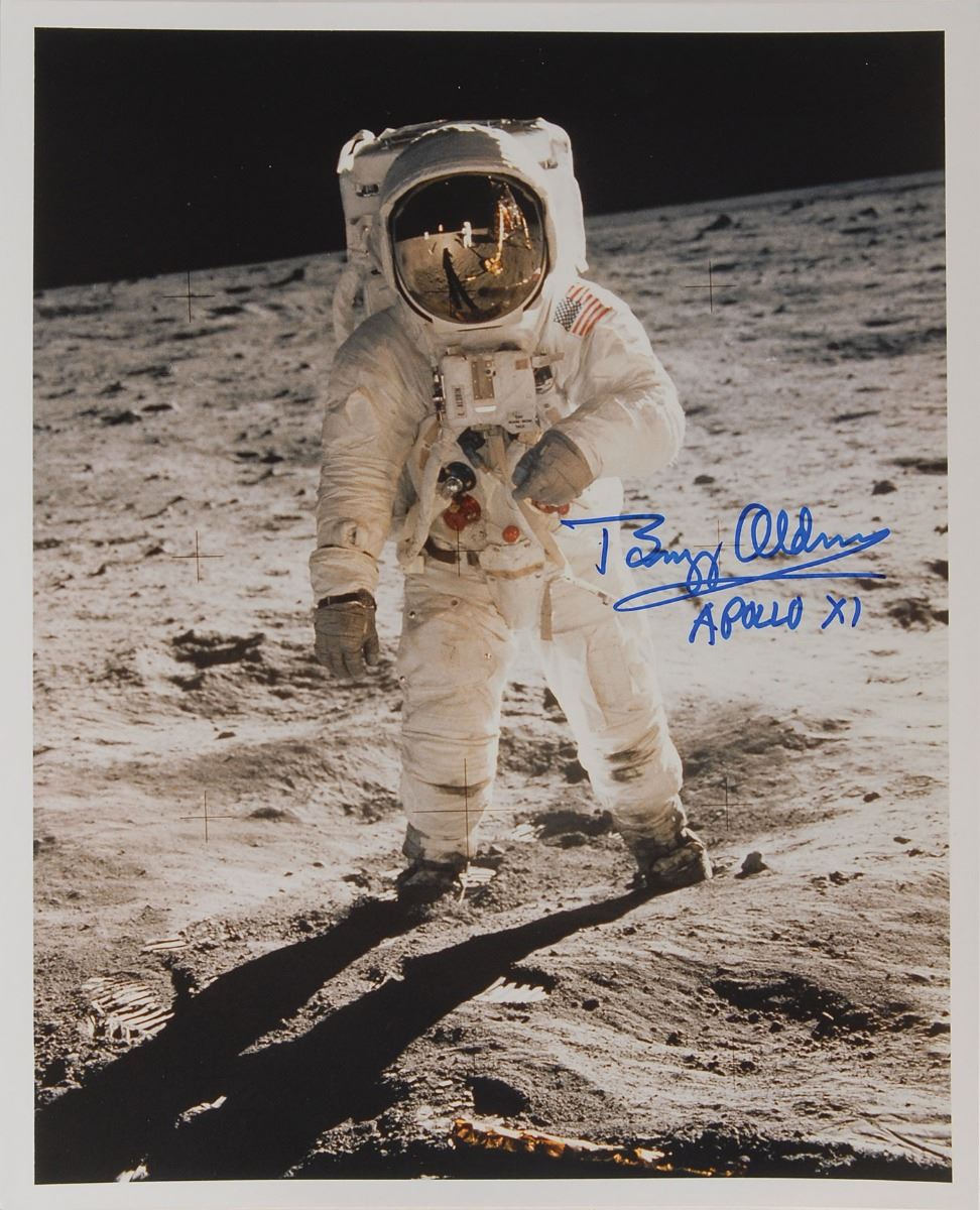 Color satin-finish 8 x 10 photo of Aldrin standing on the surface of the moon, with Neil Armstrong reflected on his visor, signed in blue felt tip, “Buzz Aldrin, Apollo XI.” In fine condition.