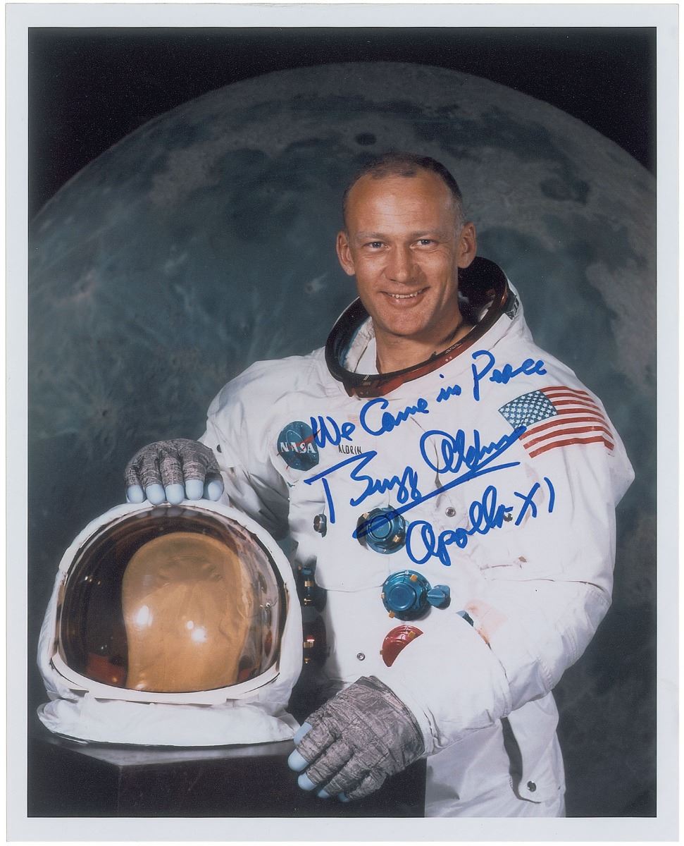 Color satin-finish 8 x 10 photo of Aldrin posing in his white space suit against a lunar backdrop, signed in blue felt tip, “We Came in Peace, Buzz Aldrin, Apollo XI.” In fine condition.