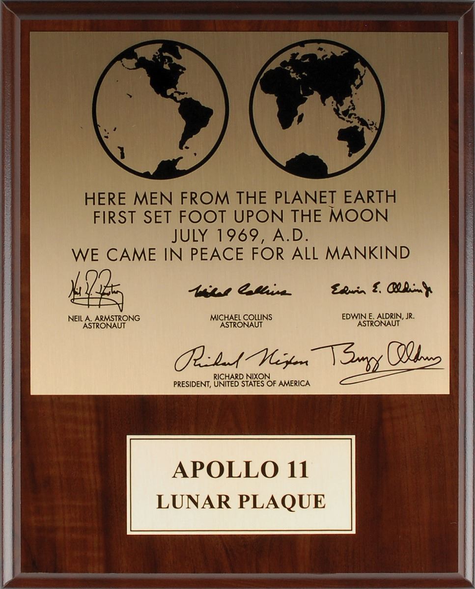 Appealing replica of the first lunar plaque left on the surface of the moon during the Apollo 11 mission, consisting of two information plates affixed to a 10.5 x 13 wooden base, signed on the top plate in black felt tip by Buzz Aldrin. In fine condition.