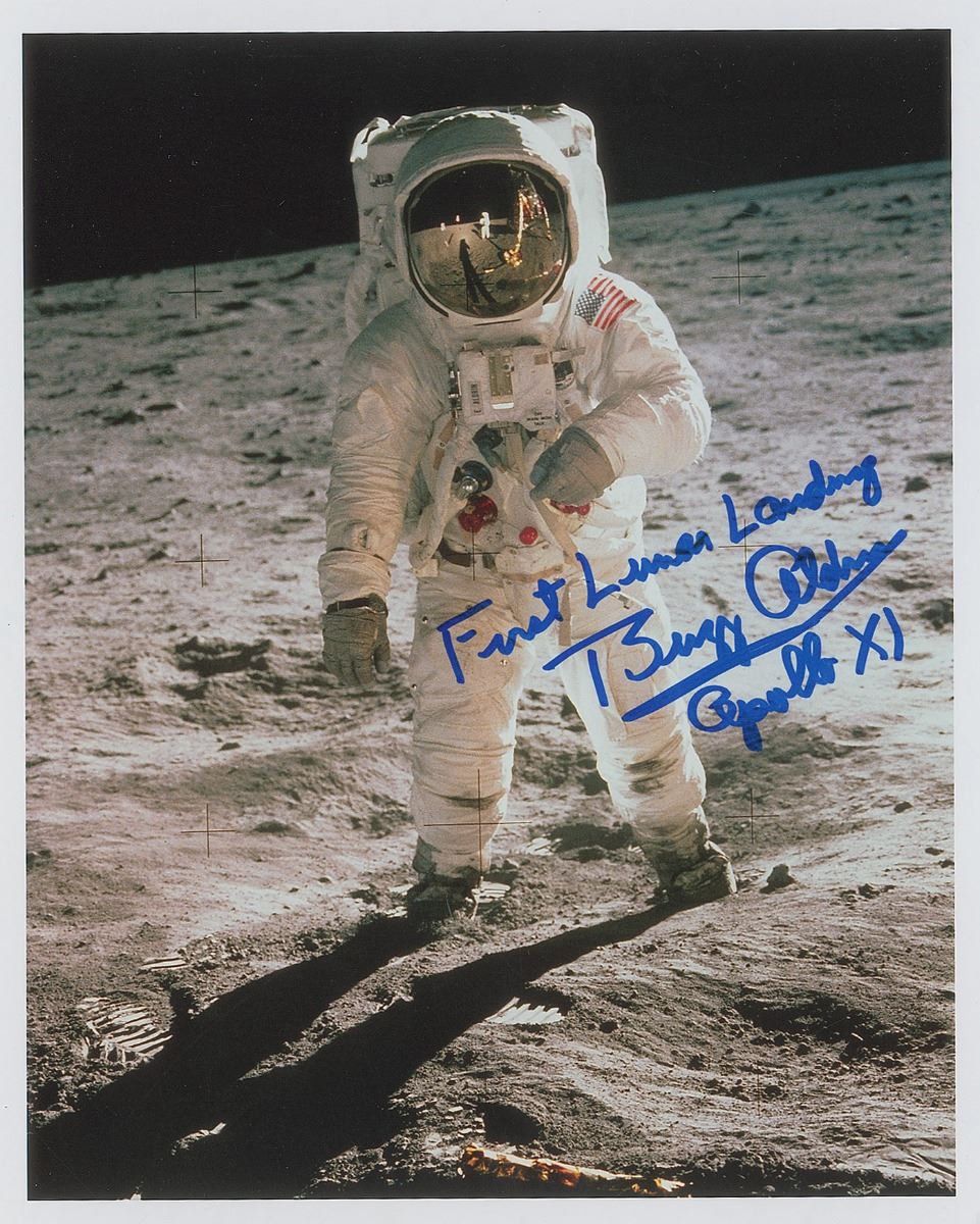 Color satin-finish 8 x 10 photo of Aldrin on the lunar surface, signed in blue felt tip, “First Lunar Landing, Buzz Aldrin, Apollo XI.” In very fine condition.