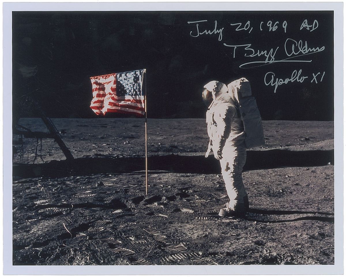 Color satin-finish 10 x 8 photo of Aldrin standing next to the American flag on the lunar surface, signed in silver ink, “July 20, 1969 AD, Buzz Aldrin, Apollo XI.” In very fine condition.