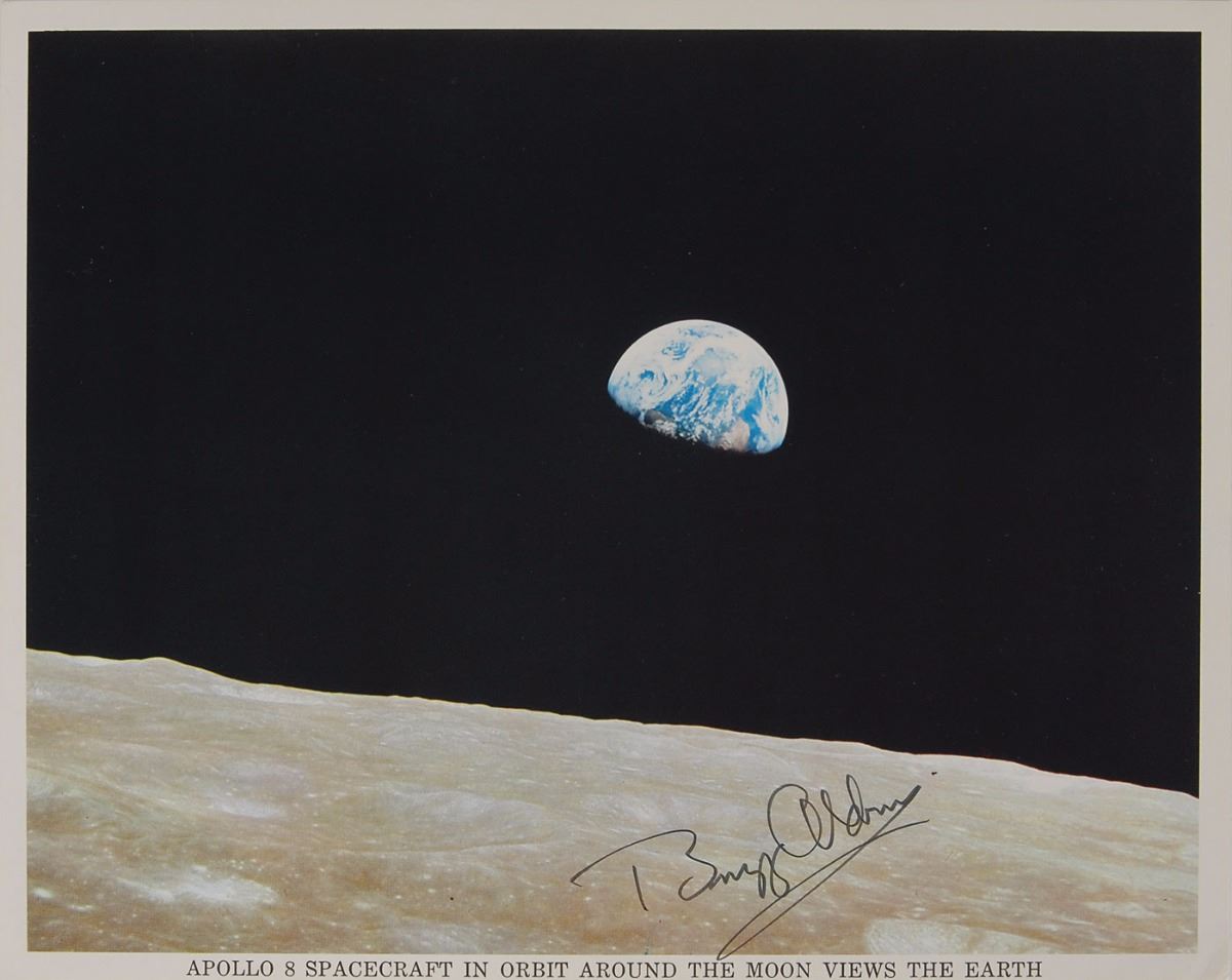 Official color 10 x 8 NASA lithograph of the famous Apollo 8 ‘Earthrise,’ signed in black felt tip. In fine condition.