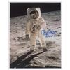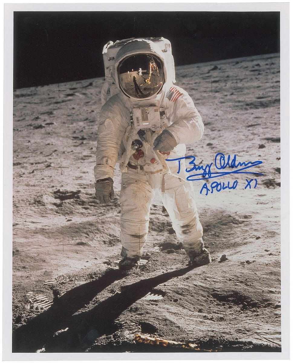 Color semi-glossy 8 x 10 full-length photo of Aldrin standing on the lunar surface, the reflection of Neil Armstrong in his visor, signed in blue felt tip, “Buzz Aldrin, Apollo XI.” In very fine condition.