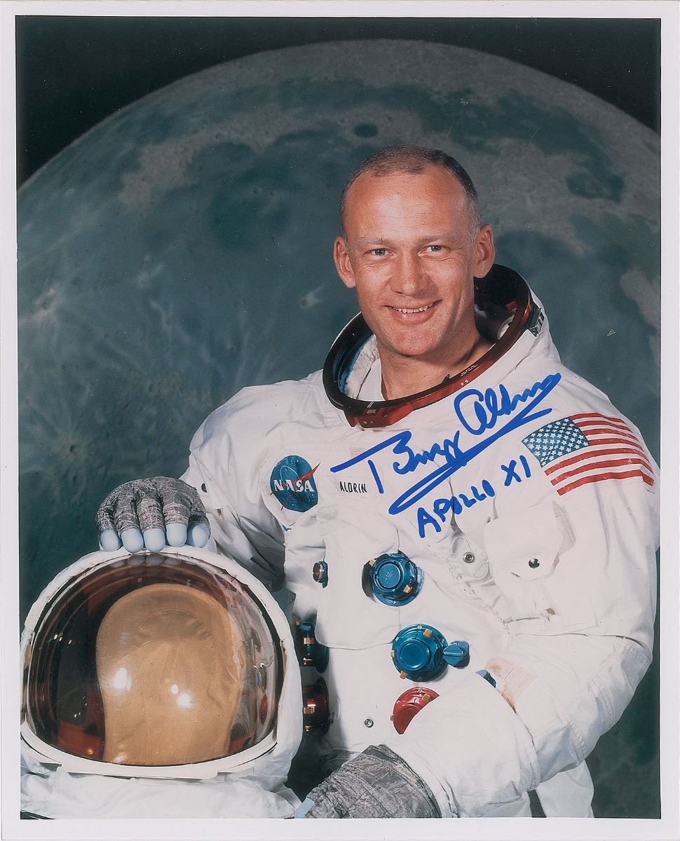 Color semi-glossy 8 x 10 photo of Aldrin posing in his white space suit against a lunar backdrop, signed in blue felt tip, “Buzz Aldrin, Apollo XI.” In very fine condition.
