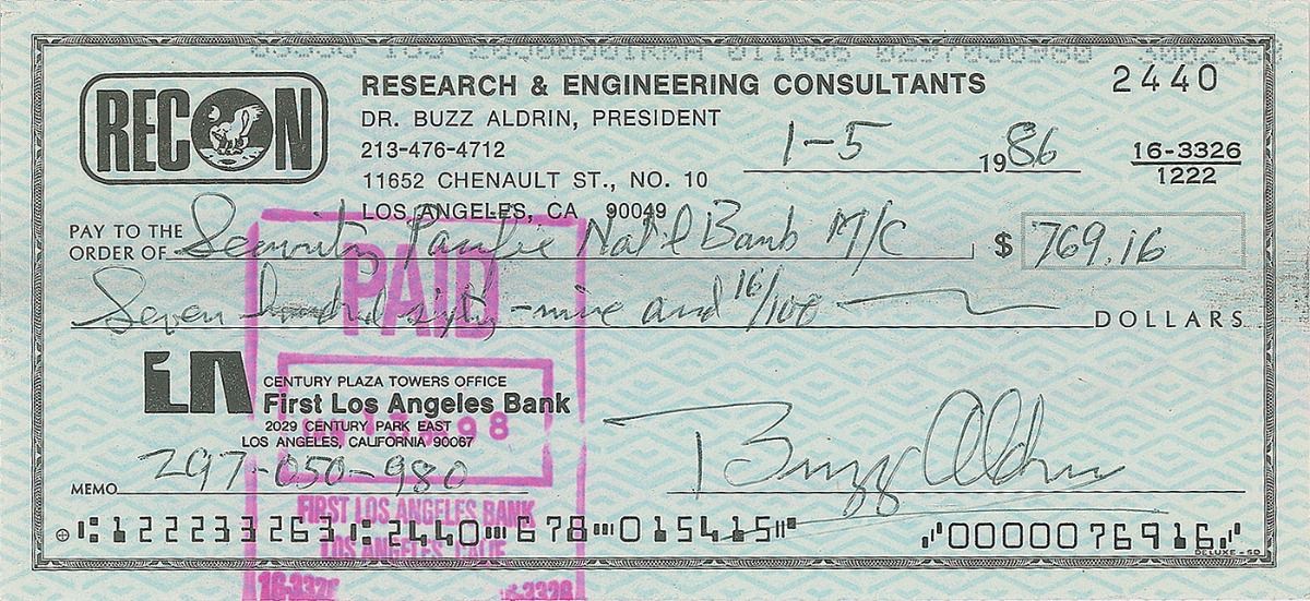 RECON business check, 6 x 2.75, filled out and signed by Aldrin, payable to Security Pacific National Bank for $769.16, January 5, 1986. In fine condition.