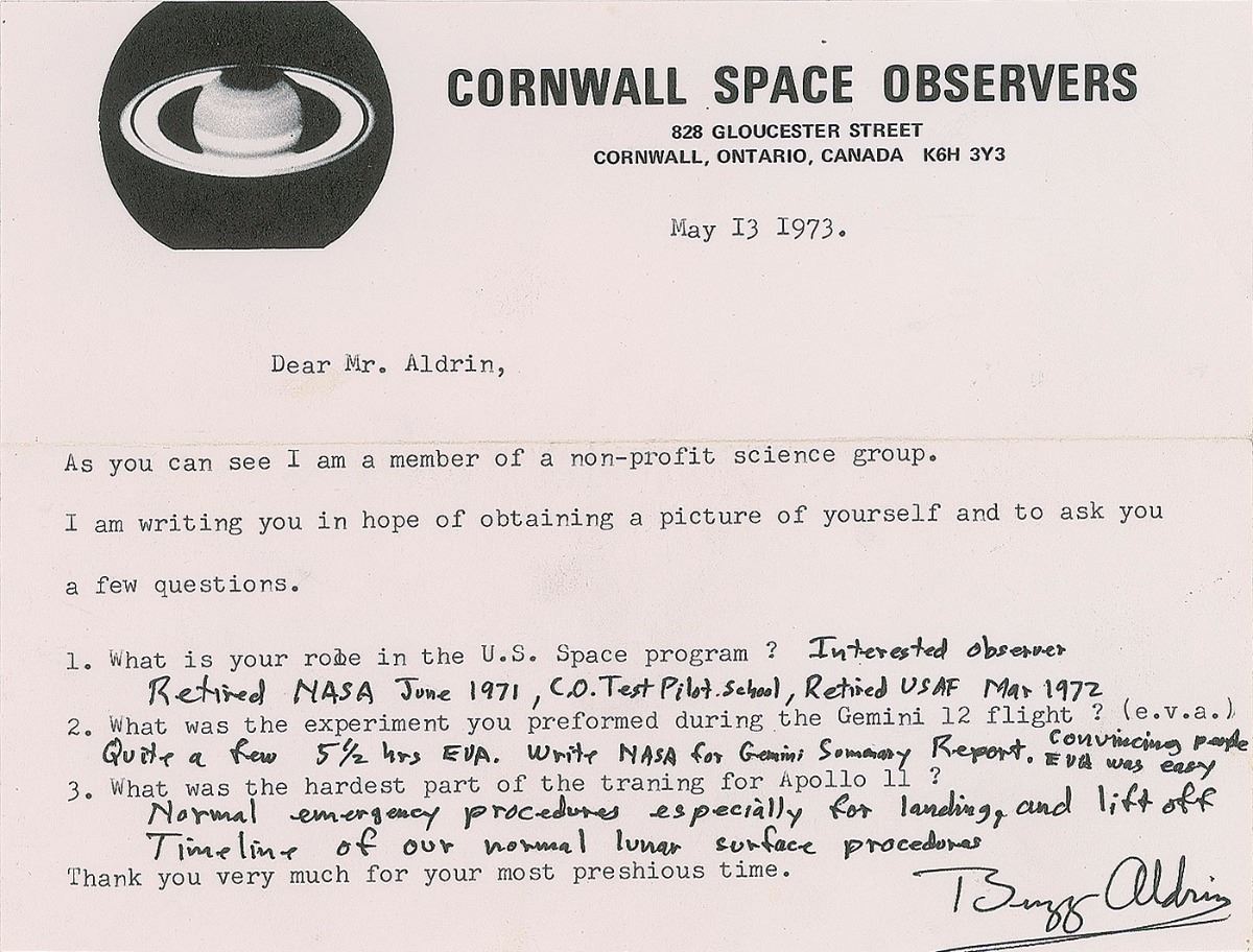 Handwritten answers from Aldrin on a typed letter from the Cornwall Space Observers, 8.5 x 6.5, May 13, 1973. Aldrin responds to three questions in black ink and signs his name at the conclusion. First question: "What is your role in the U. S. Space programs? [Aldrin] Interested Observer. Retired NASA June 1972, C. O. Test Pilot School, Retired USAF Mar 1972." Second question: "What was the experiment you performed during the Gemini 12 flight? (e.v.a.) [Aldrin] Quite a few 5 1/2 hrs EVA. Write NASA for Gemini Summary Report. Convincing people EVA was easy." Third question: "What was the hardest part of the training for Apollo 11? [Aldrin] Normal emergency procedures especially for landing, and lift off. Timeline of our normal lunar surface procedures." In fine condition.