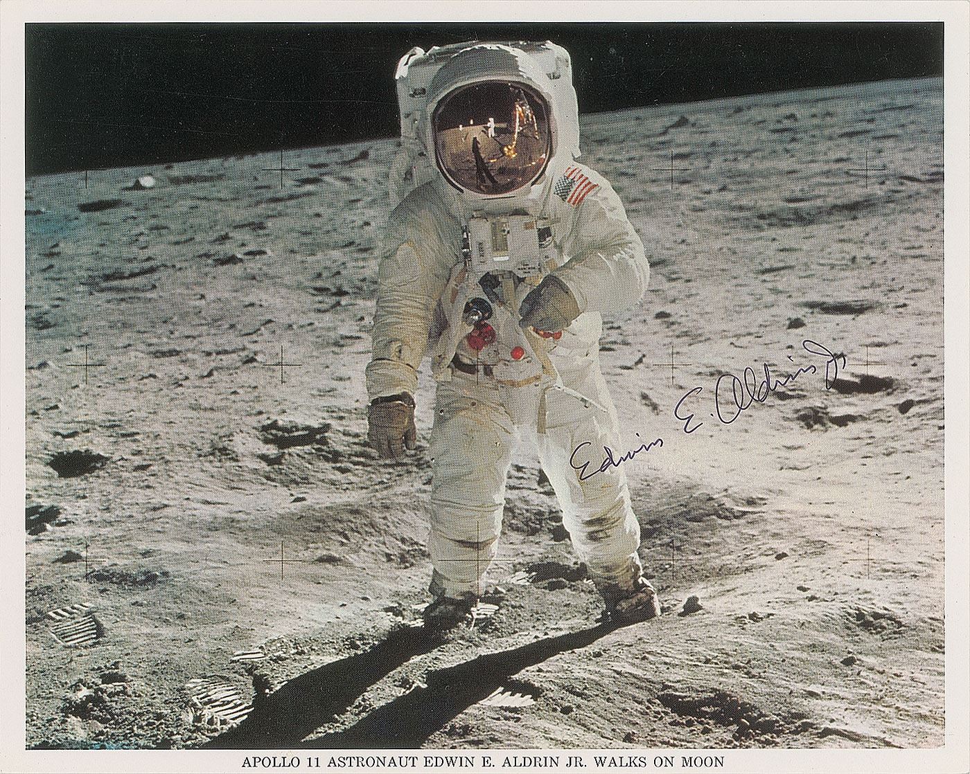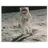 Official color 10 x 8 NASA lithograph of Aldrin posing on the surface of the moon, signed in black ink, "Edwin E. Aldrin, Jr." In very fine condition. Accompanied by a certificate of authenticity from Novaspace.