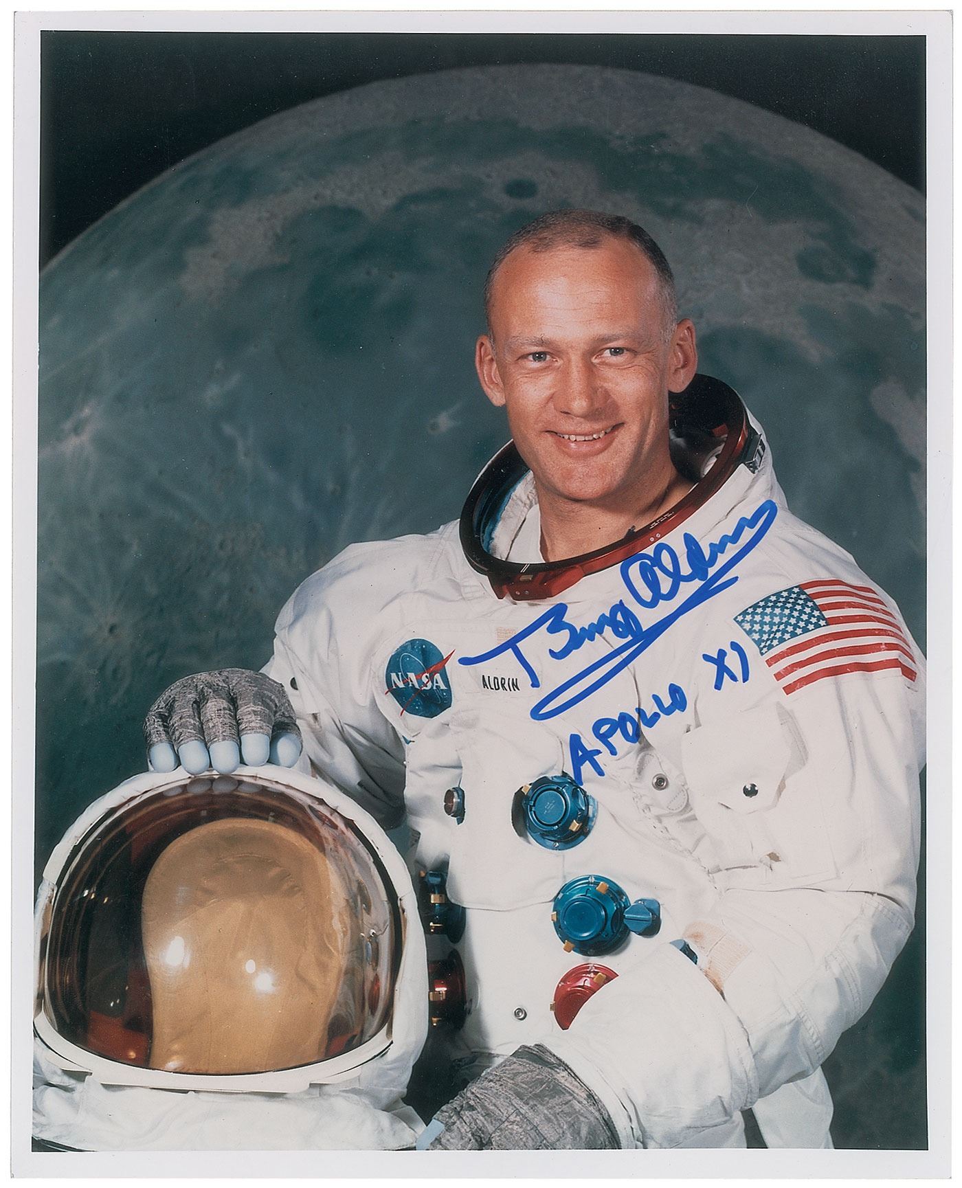 Color semi-glossy 8 x 10 photo of Aldrin posing in his white space suit against a lunar backdrop, signed in blue felt tip, “Buzz Aldrin, Apollo XI.” In fine condition.