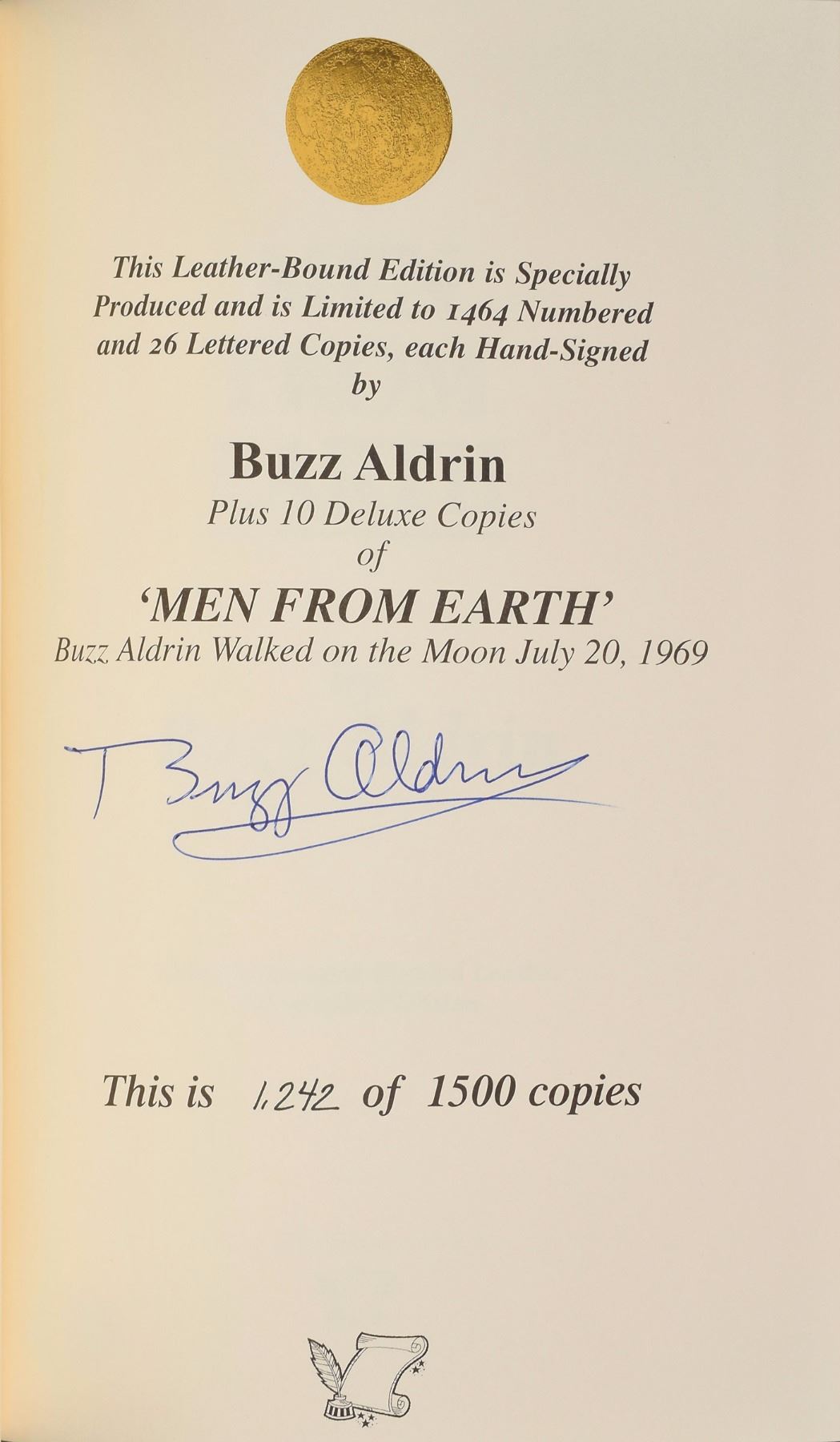 Signed book: Men from Earth. First edition, limited issue, numbered 1242/1500. Nashville, TN: The FlastSigned Press, 2005. Leatherbound hardcover, 6.5 x 9.25, 262 pages. Signed on the colophon in blue ballpoint by Aldrin. In fine condition. Accompanied by the publisher's certificate of authenticity.