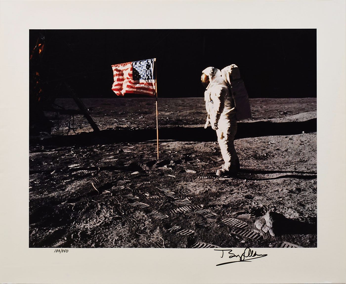 Color limited edition 27 x 22 print of Aldrin standing before an American flag in the Sea of Tranquility, numbered 133/350, prominently signed in the lower border in black felt tip, "Buzz Aldrin." Rolled and in fine condition, with a few scattered dings. Accompanied by a copy of a certificate of authenticity from Aldrin.